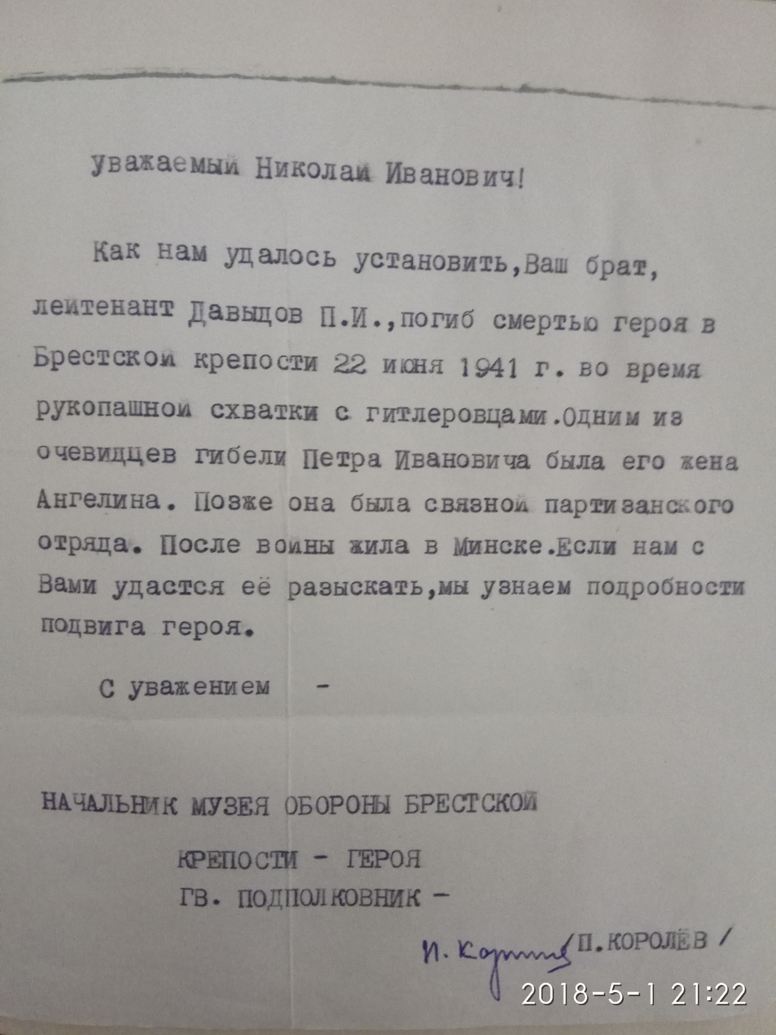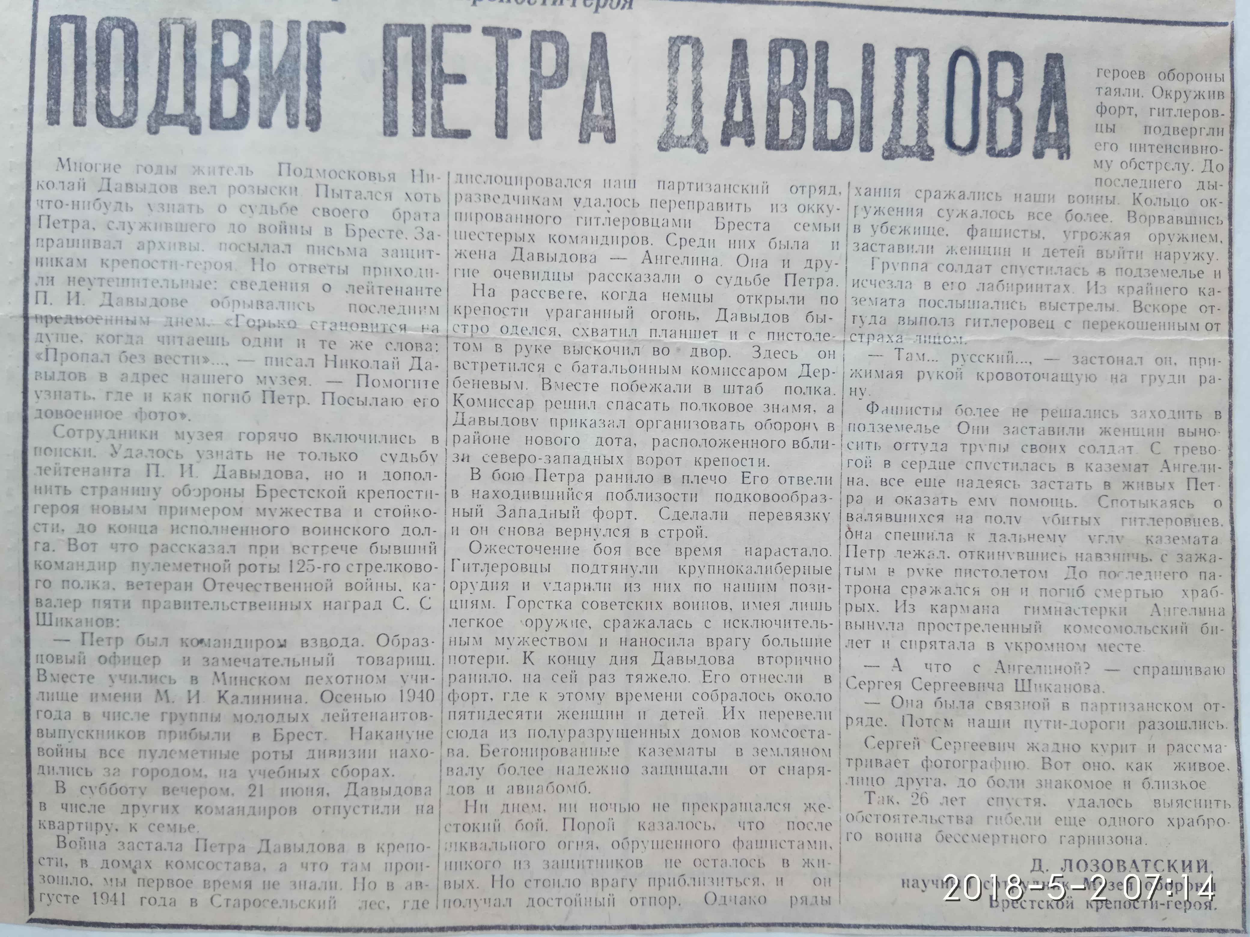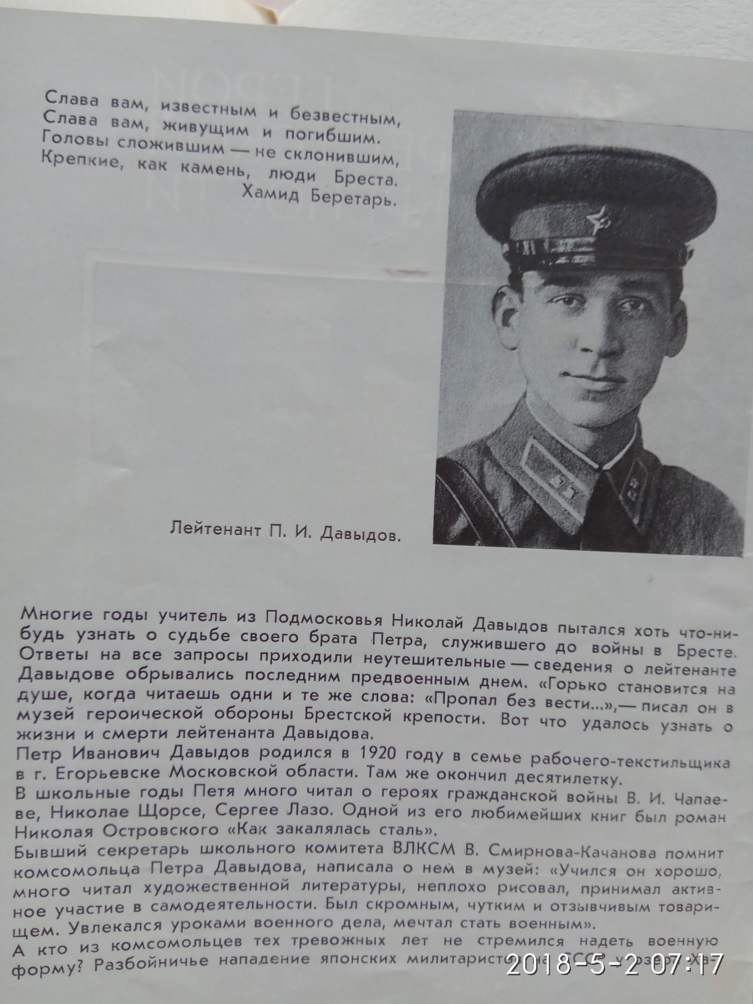 Летом 1967 года Н.И. Давыдов, уже вернувшийся в Егорьевский район и работавший в д. Колычево, с группой педагогов поехал на экскурсию в Брест. Там он обратился в музей за информацией о своём брате. И вдруг выяснилось, что лейтенант П.И. Давыдов значится в списках погибших защитников крепости! Правда, никаких подробностей об этом не имелось. Зато работники музея нашли адрес С.С. Шиканова, который в 1941 году был командиром пулеметной роты 125-го стрелкового полка и являлся прямым воинским начальником Петра Давыдова, а также его товарищем по учёбе в МВУ. Николай Иванович отправил письмо С.С. Шиканову. В ответном послании тот сообщал, что в последние дни перед войной их подразделение находилось в полевом лагере, где проводили стрельбы из станковых пулемётов. Вечером 21 июня, в субботу, лейтенант Давыдов попросил отпустить его до утра домой. Больше друзья-однополчане не виделись: в 4 часа начались бомбёжки и артобстрелы, немцы перешли границу… - Спустя месяц в партизанский отряд, где находился и я, смогли пробраться из Бреста семьи шести командиров, в том числе и жена Петра Ивановича Давыдова – Ангелина Иосифовна, – сообщал в своём письме С.С. Шиканов. – Она рассказала нам, как её муж и другие бойцы с первых минут войны вступили в бой, как держали оборону и погибли. Сама же Ангелина Давыдова активно включилась в партизанское движение, в дальнейшем была переправлена на «большую землю», а затем вернулась на родину – в Минск. Потом следы её затерялись. Казалось бы, Н.И. Давыдов мог завершить свой поиск. Судьба старшего брата выяснилась. Его героическую смерть подтвердило официальное письмо от руководства музея обороны Брестской крепости. О лейтенанте Давыдове рассказали республиканская газета «Советская Белоруссия» и СМИ Егорьевского района…