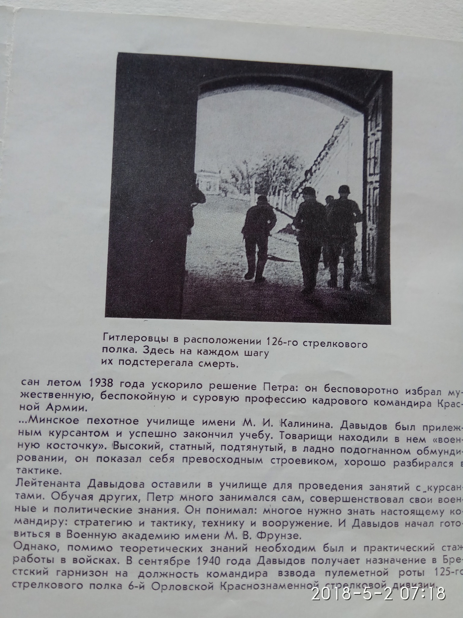 Николай Иванович стал посылать запросы в архивы, в «Комсомольскую правду», пытался найти сослуживцев брата. Первой откликнулась из г. Орла бывший военфельдшер 125-го стрелкового полка Раиса Абакумова. Она хорошо знала лейтенанта Давыдова, однако перед войной была переведена в армейский госпиталь и 22 июня 1941 года Петра не видела и ничего о нём не слышала. Вместе с тем Р. Абакумова дала Н.И. Давыдову адрес бывшего старшего военврача 125-го полка М.Н. Гаврилкина – он, оказывается, жил недалеко от Егорьевска, в пос. Рязановский. Произошёл обмен письмами, но и здесь – почти никаких новых данных. Как сообщил М.Н. Гаврилкин, лейтенант Давыдов с женой жил не в крепости, а за её территорией, в домах комсостава. При штурме Бреста немцы сразу же рассекли наш гарнизон на части, между которыми практически не было связи…