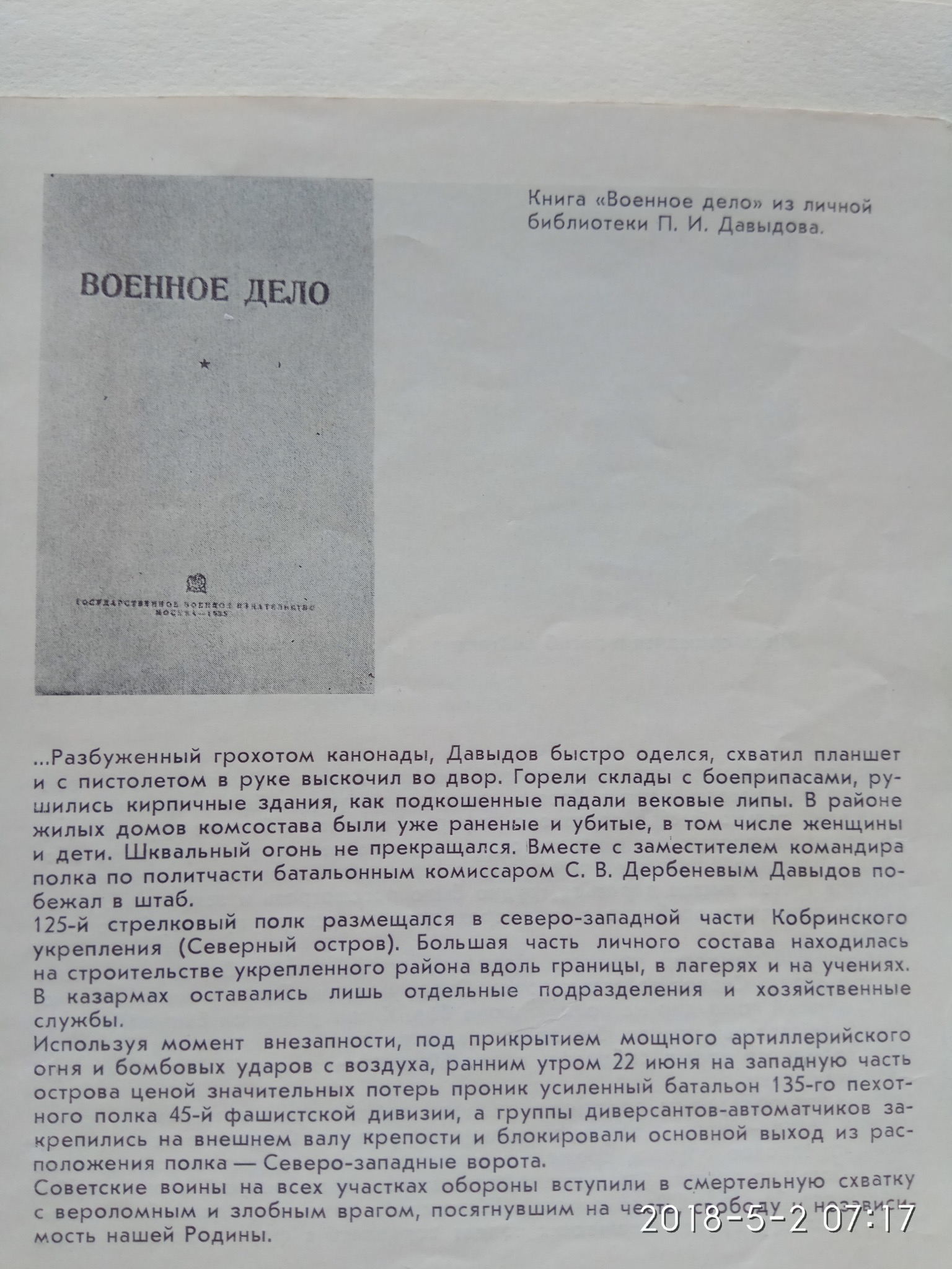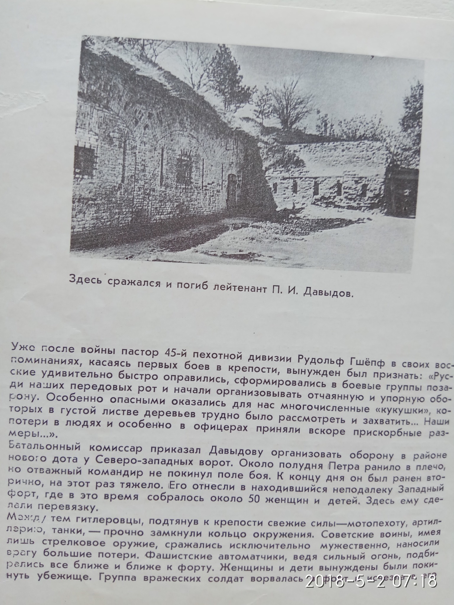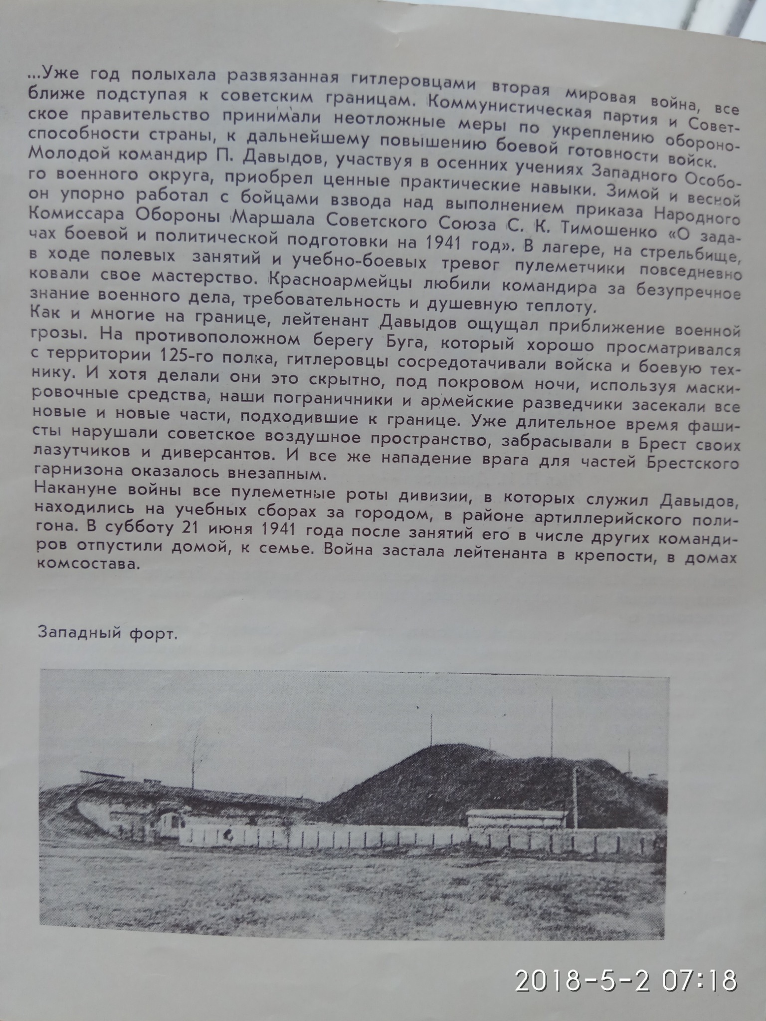22 июня 1941г. - лейтенант Петр Иванович Давыдов геройски погиб в Западном форте Кобринского укрепления Брестской крепости.
