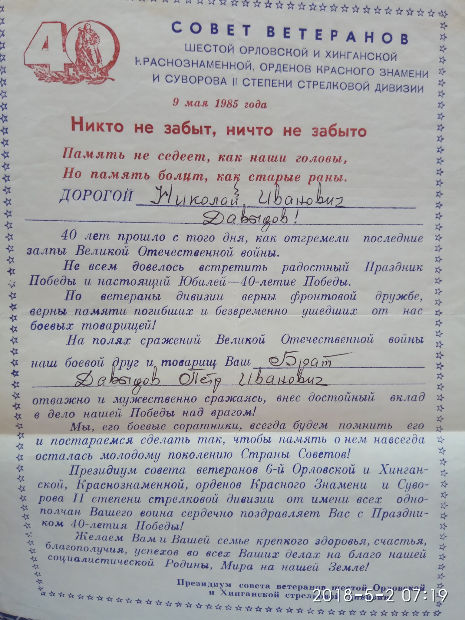 Младший брат Пётра - Давыдов Николай Иванович - мой дедушка, который всю жизнь посвятил поиску брата.