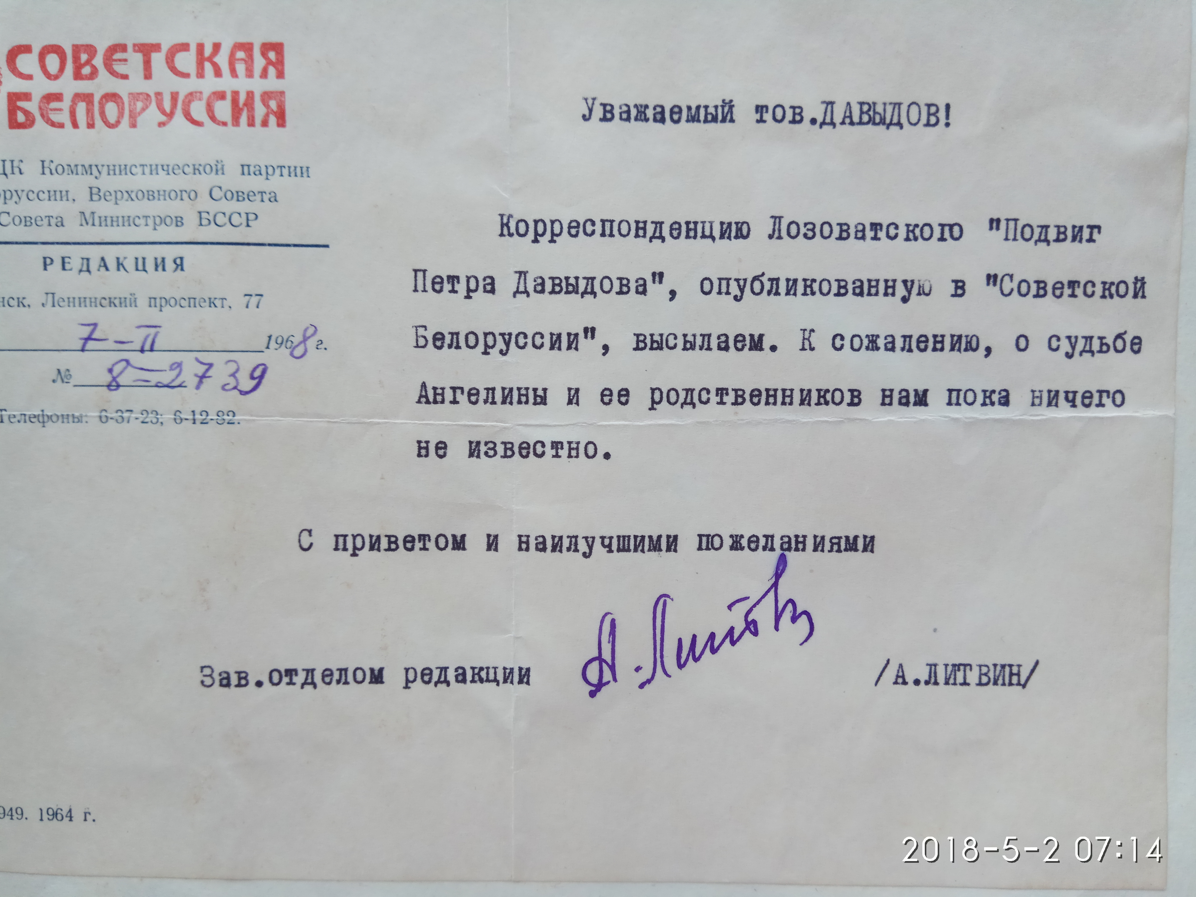 Но Николаю Ивановичу хотелось разыскать ещё и жену Петра Ивановича – Ангелину Иосифовну. И настойчивость увенчалась успехом. Как вспоминал Н.И. Давыдов, об этой истории случайно узнал преподаватель одного из Минских вузов П.М. Кирюшин, который оказался уроженцем с. Починки нашего района и решил помочь землякам. Его стараниями Минское телевидение 6 февраля 1968 года показало фотографию П.И. Давыдова с супругой. И на передачу откликнулась сама Ангелина Иосифовна! Спустя полтора месяца А.И. Давыдова выступила по Минскому телевидению и рассказала о подвиге мужа и своей дальнейшей судьбе. Передачу записали на магнитофонную ленту и выслали в Егорьевский краеведческий музей. Никогда не видевшиеся ранее и почти ничего не знавшие друг о друге родственники стали переписываться. Так Николай Иванович буквально из первых рук узнал о том, как погиб старший брат.