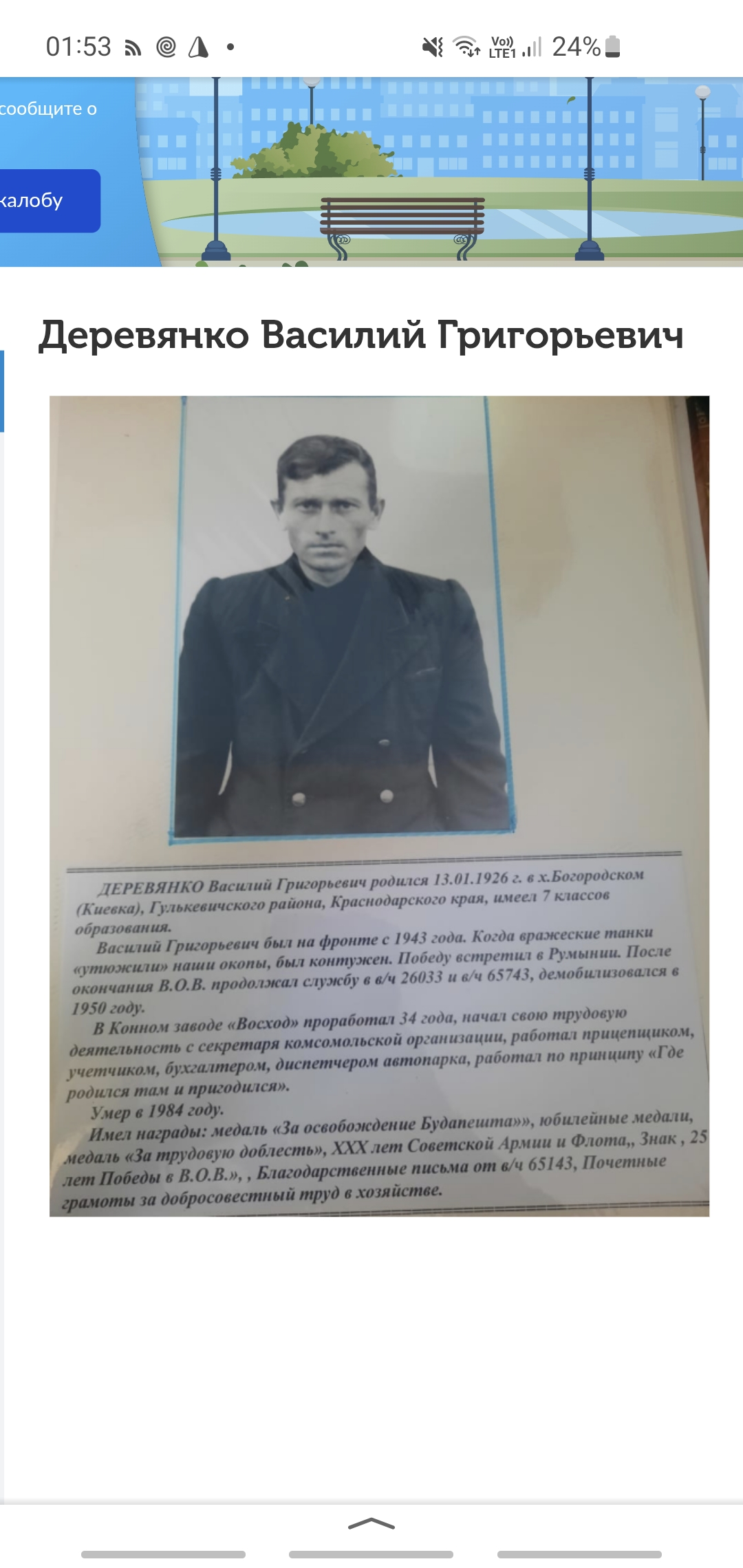 Когда вражеские танки окружили наши окопы был контужен.. После окончания ВОВ продолжил службу в В/Ч 26033 и В/Ч 65743, где демобилизовался в 1950 году. В конном заводе «Восход» проработал 34, начал свою трудовую деятельность с секретаря комсомольской организации, работал прицепщиком, учетчиком, бухгалтером, диспетчером автопарка. Умер в 1984 году. Медаль за освобождение Будапешта, За трудовую доблесть, ХХХ лет Советской армии и флота, знак 25 лет победы в ВОВ, Благодарственные письма от В/Ч 65143, Почетные грамоты за добросовестный труд в хозяйстве. Был на фронте с 1943 года( в 17 лет!) Победу встретил в Румынии