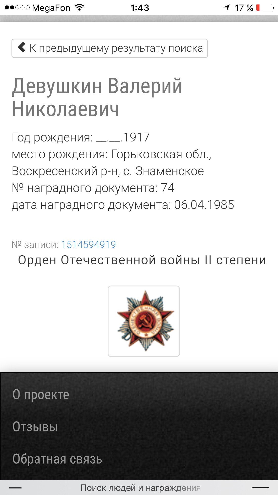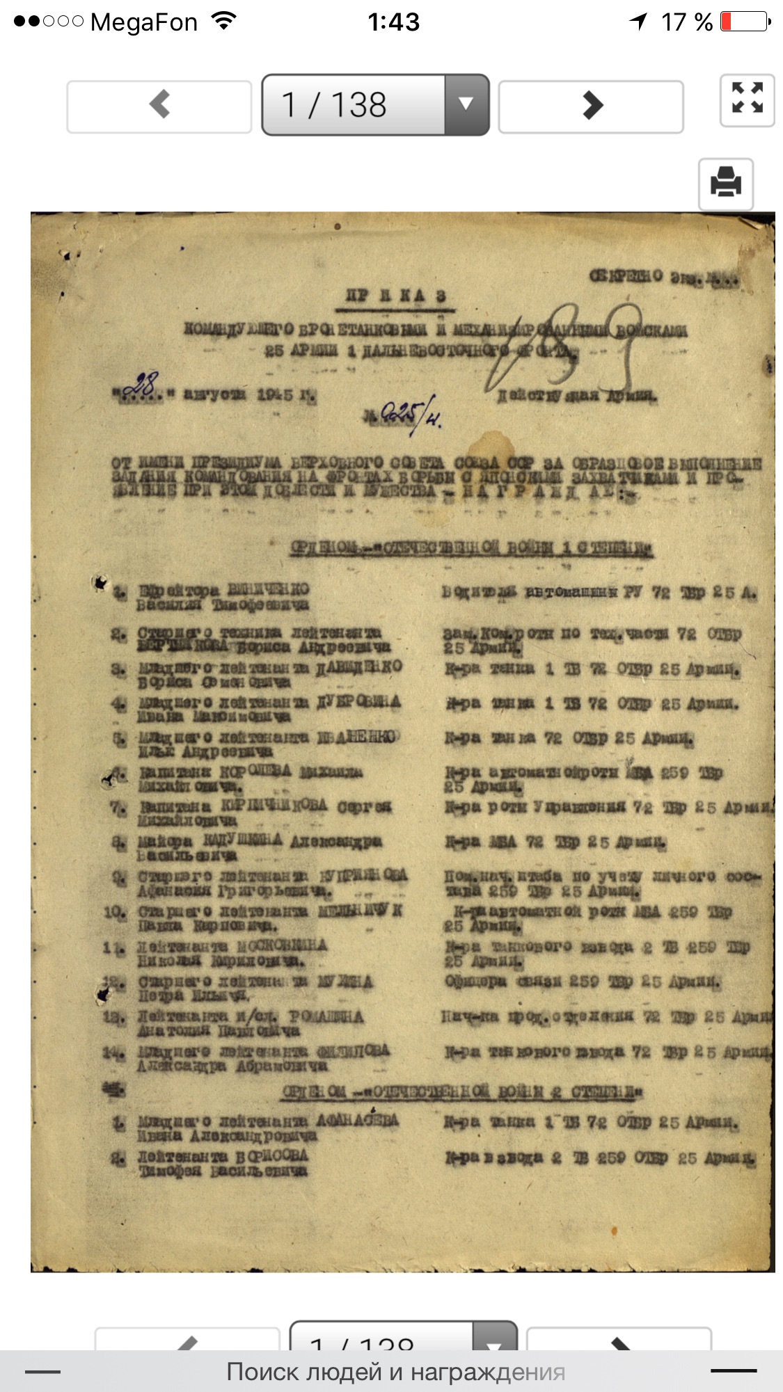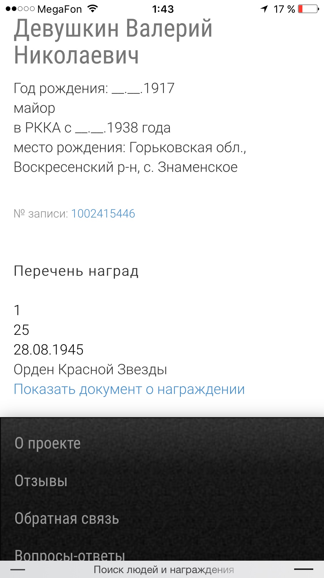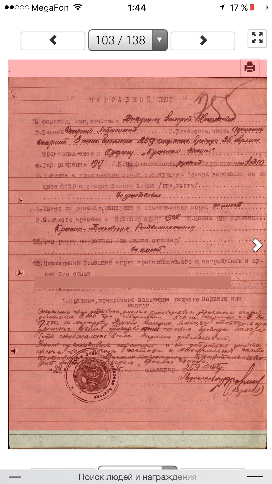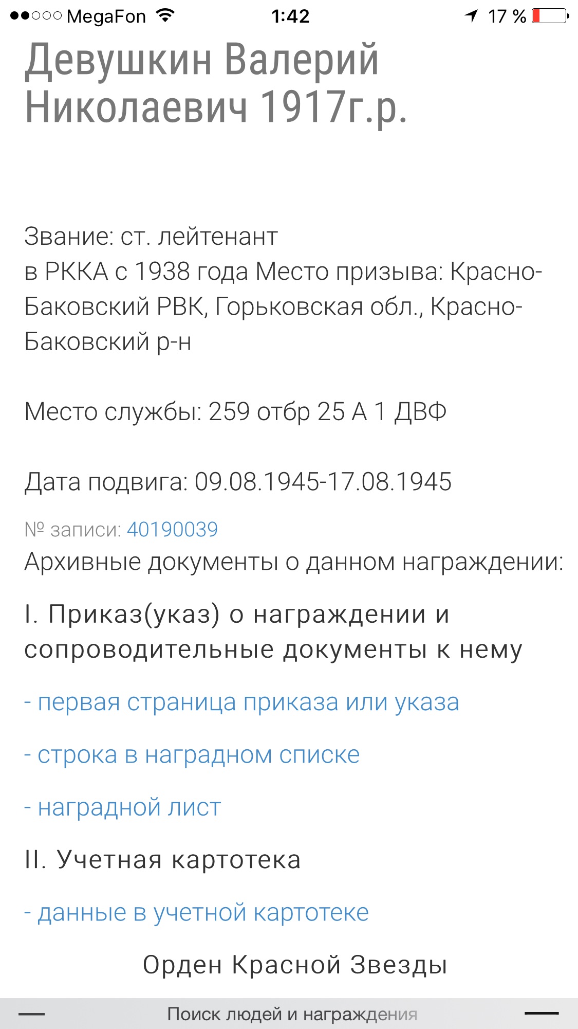 Место призыва: Красно-Баковский РВК, Горьковская обл., Красно-Баковский р-н Дата начала службы: 04.09.1938 Части и подразделения: 48 орб 35 сд ДВФ 259 отбр 25 А ДВФ Награды: Медаль «За победу над Японией» Дата завершения службы: 26.02.1964 Перечень наград 1 28.08.1945 Орден Красной Звезды 2 20.06.1949 Медаль «За боевые заслуги» 3 30.04.1954 Орден Красной Звезды 4 30.09.1945 Медаль «За победу над Японией» 5 06.04.1985 Орден Отечественной войны II степени