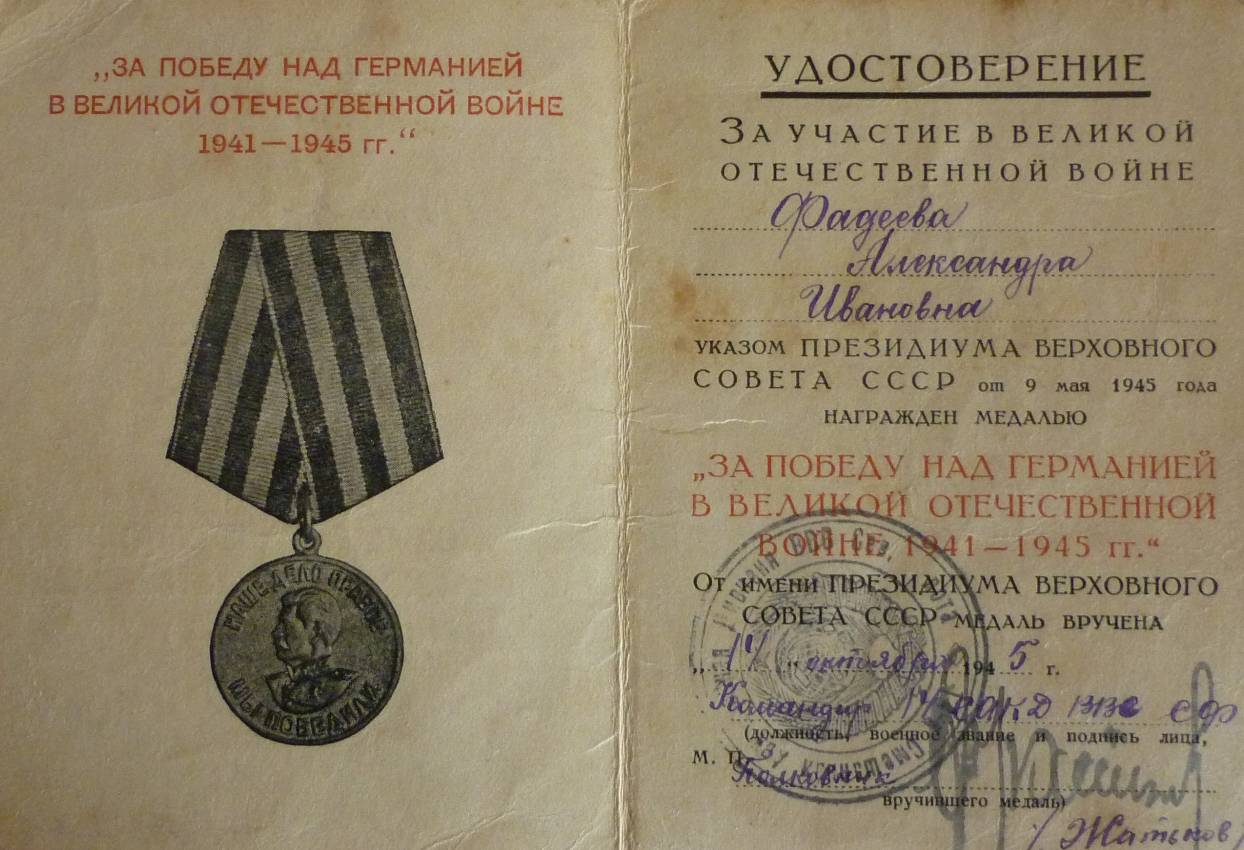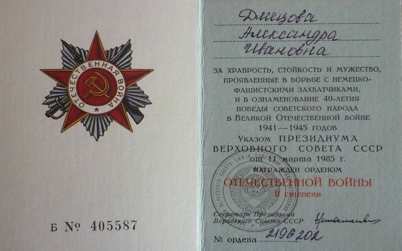 войны 2-й степени, юбилейными медалями.В 1946 году Александра Ивановна вышла замуж за Сергея
