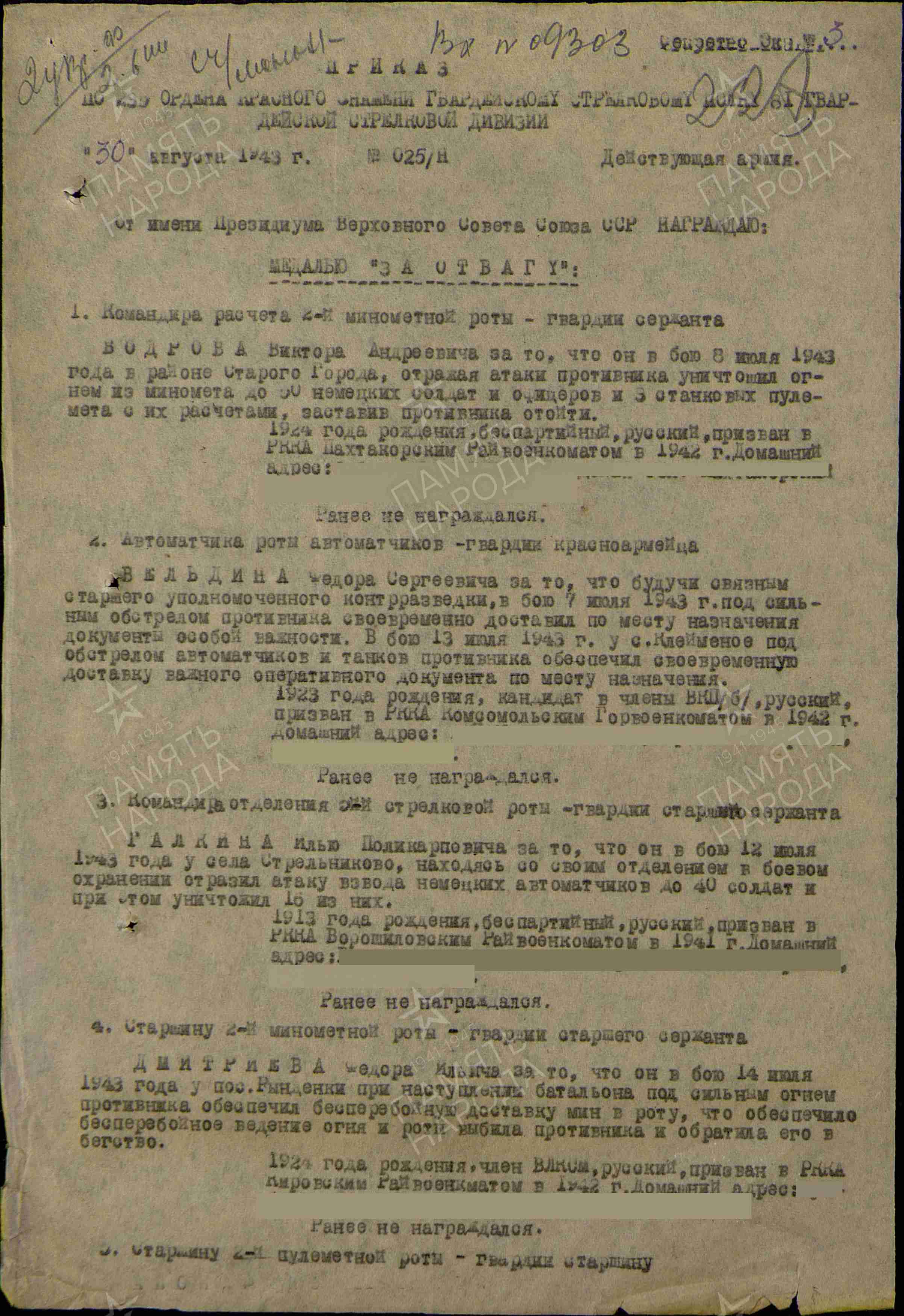 Дмитриев Федор Ильич-гв.ст.сержант, старшина 2-й минометной роты 235-гоГв.КРЗ,СП 81-й Гв.СД. В бою14.07.43г за п. Рынденки при наступление б-на под сильным огнем противника обеспечил бесперебойную доставку мин в роту, что обеспечило ведения огня без остановки и роты выбили врага и обратили его в бегство. Приказом командира полка гвардии подполковника Скирута награжден медалью "За Отвагу" от 30.08.43г. 28.08.43г был ранен и доставлен в ЭГ-2208, где 02.09.43г умер от ран и похоронен на станции Лосево Харьковской обл.-могила № 4.