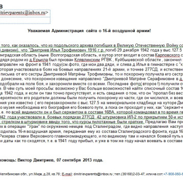 По сведениям из архива МО Илья погиб как ст.сержант из состава 277СД , и похоронку видимо отправили на имя его сестры Матрёны потому. что в дивизии не было его документов, а это значит, что он по видимому был сбит в боевых порядках 277СД, и адрес писарь установил по конверту в кармана у Ильи . Похоронен был на северо-восточной стороне выс.127.5 в 5-и км севернее хутора Дмитриевка, и потом перезахоронен на сам хутор.