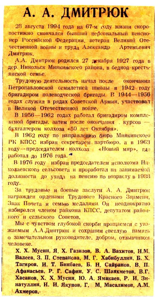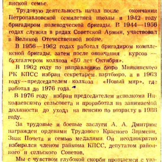 1942 году бригадиром полеводческой бригады. В 1944-1956 годах служил в рядах советской армии, участвовал в Великой Отечественной войне.В 1956-1962 годах работал бригадиром комплексной бригады, затем после окончания курсов-бухгалтером колхоза "50 лет октября". В 1962 году по направлению бюро Миякинского РК КПСС избран секретарём партбюро, а в 1963 году-председателем колхоза "Новый мир", где работал до 1976 года. В 1976 году избран председателем исполкома Николаевского сельсовета и проработал на занимаемой должности до ухода на пенсию по возрасту в 1988 году. За трудовые и боевые заслуги А.А. Дмитрюк награждён орденами Трудового Красного знамени, Знак Почёта и семью медалями. Он неоднократно избирался членом райкома КПСС, депутатом районного и сельского Советов. Мы с чувством глубокой скорби прощаемся с уважаемым А.А. Дмитрюк и сохраним светлую память о замечательном руководителе, добром, отзывчивом человеке. Ещё, я бы хотела обратиться к молодому поколению, моему поколению. Ребята, наша память очень ценная штука в жизни, в ней мы храним, как в архиве, все события. Но в архивах и документах не хранят человеческих эмоций и