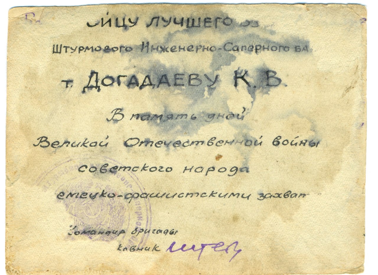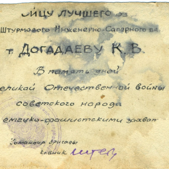 Догадаев Константин Васильевич,родился 18 марта 1910 года в Вологодской области. В РККА с 1939 года. Призывался в Пашском РВК Ленинградской области. Воевал на Карельском фронте.Сапер 64-го отдельного штурмового инженерно-саперного батальона.Был парторгом роты. Несмотря,на сильный минометный огонь противника и глубокий снежный покров,самолично разминировал 132 мины ПОМЗ-2 натяжного действия.За что и был награжден Орденом Красной Звезды (приказ от 24.03.1944г). Имел много боевых наград. После войны жил с семьей и работал в городе Новая Ладога.