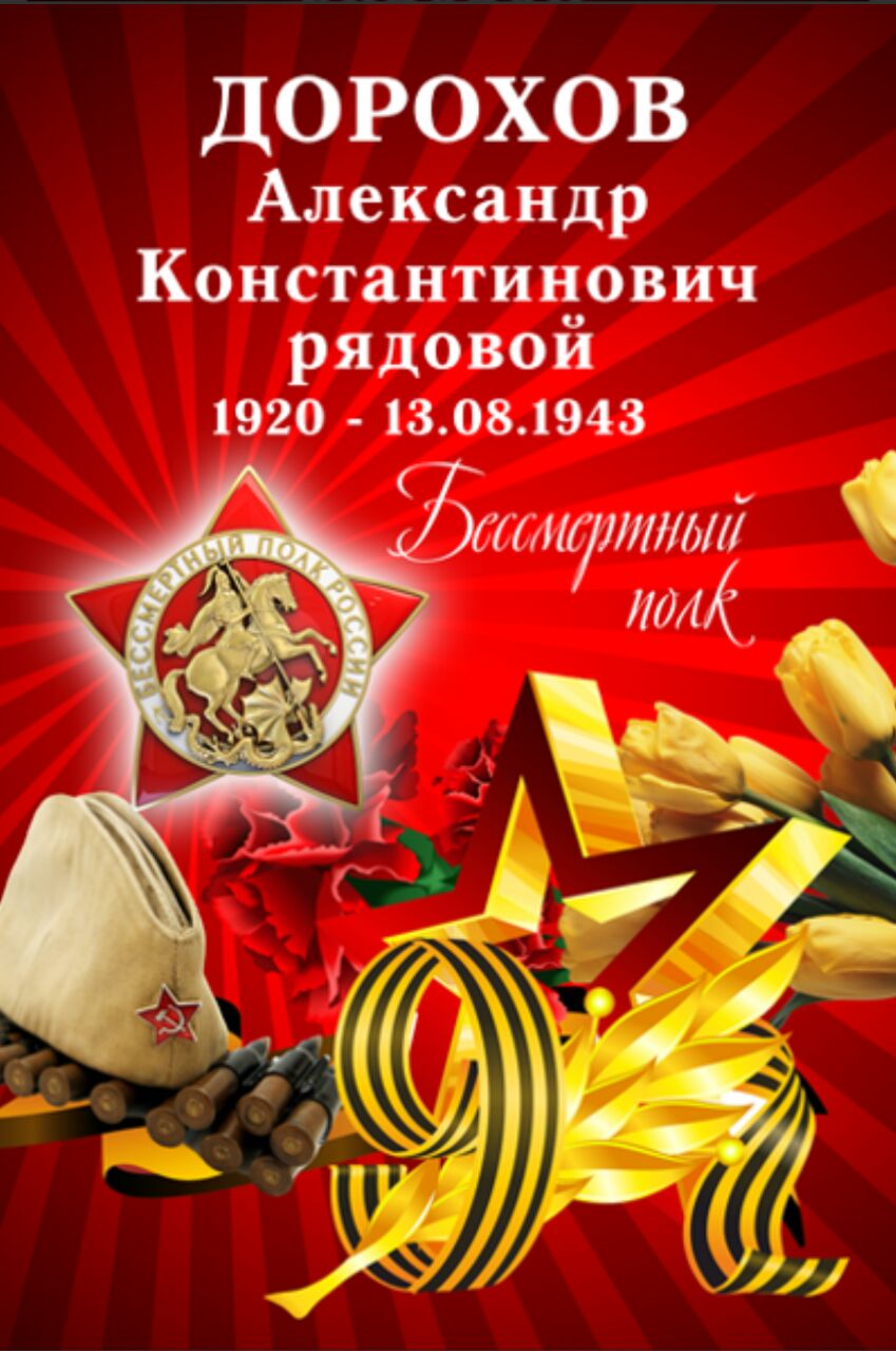 У Константина Тимофеевича Дорохова было 2 сына: Василий 1918 г.р. и Александр 1920 г.р. Жили они в деревне Епанчино, Каменского района, Тульской области. Братья  на фронт были призваны  с первых дней войны. Оба служили в стрелковых дивизиях. Василий воевал в героической 298 стрелковой дивизии, защищавшей Сталинград. Александр бил фашистов в 116 стрелковой дивизии, в должности связиста. Их любили, ждали от них писем с войны, молились за них. Но они не пришли с войны, в свою родную деревушку, не дожили до победы, до весны 1945 г., когда их деревушка расцветала черемухой и сиренью. Василий был убит в Сталинградской битве 2 декабря 1942 г. А Александр был убит в бою 13 августа 1943 г., освобождая Украину от фашизма. Братьям не было и 25 лет, но они прошли на земле трудный путь - испытание войной. Спасибо братья Дороховы за ратный подвиг и Победу!!!