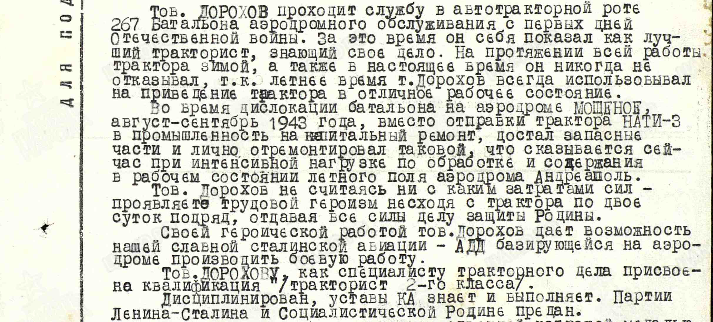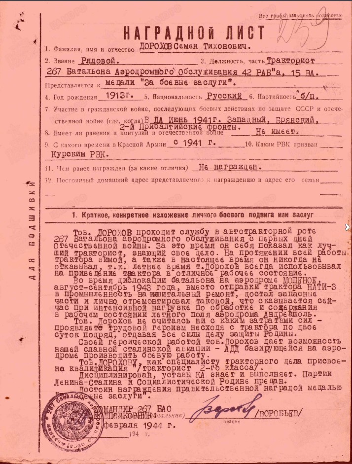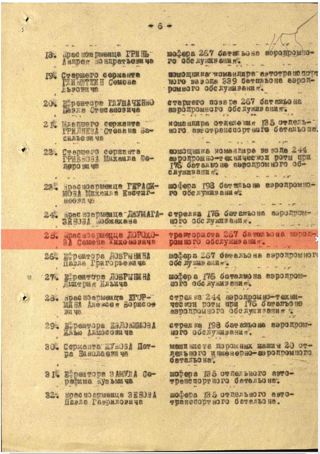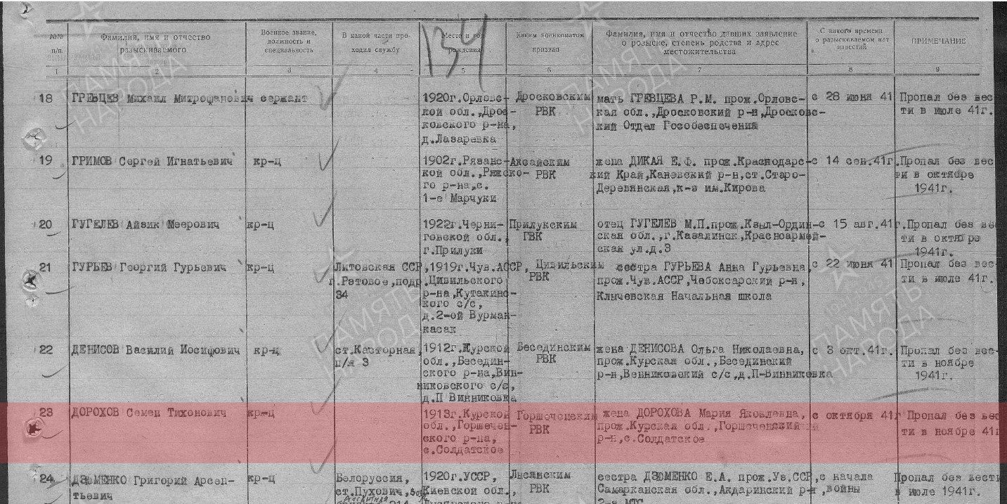 Наименование военкомата: Курский ОВК, Курская обл. Дата и место призыва: Курский ОВК, Курская обл. Дата поступления на службу: __.__.1941. Воинское звание: красноармеец. Воинская часть: 42 РАБ. Наименование награды: Медаль «За боевые заслуги». Кто наградил: 15 воздушная армия. Приказ подразделения. №: 22/н от: 30.04.1944. Издан: ВС 15 ВА. Информация об архиве: Архив: ЦАМО. Фонд ист. информации: 33. Опись ист. информации: 686044. Дело ист. информации: 4120. Наименование награды: Орден Отечественной войны II степени. Номер документа: 74. Дата документа: 06.04.1985. Информация об архиве - Архив: ЦАМО. Картотека: Юбилейная картотека награждений. Расположение документа: шкаф 15, ящик 20. Какое-то время Дорохов Семён считался без вести пропавшим, но он вернулся и побывал ещё на советско-японской войне. Вернулся домой в 1946 году.