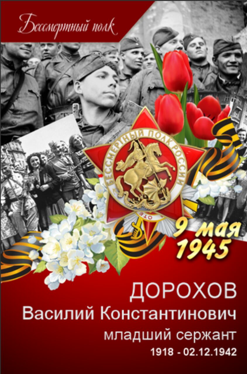 У Константина Тимофеевича Дорохова было 2 сына: Василий 1918 г.р. и Александр 1920 г.р. Жили они в деревне Епанчино, Каменского района, Тульской области. Братья на фронт были призваны с первых дней войны. Оба служили в стрелковых дивизиях. Василий воевал в героической 298 стрелковой дивизии, защищавшей Сталинград. Александр бил фашистов в 116 стрелковой дивизии, в должности связиста. Их любили, ждали от них писем с войны, молились за них. Но они не пришли с войны, в свою родную деревушку, не дожили до победы, до весны 1945 г., когда их деревушка расцветала черемухой и сиренью. Василий был убит в Сталинградской битве 2 декабря 1942 г. А Александр был убит в бою 13 августа 1943 г., освобождая Украину от фашизма. Братьям не было и 25 лет, но они прошли на земле трудный путь - испытание войной. Спасибо братья Дороховы за ратный подвиг и Победу!!!