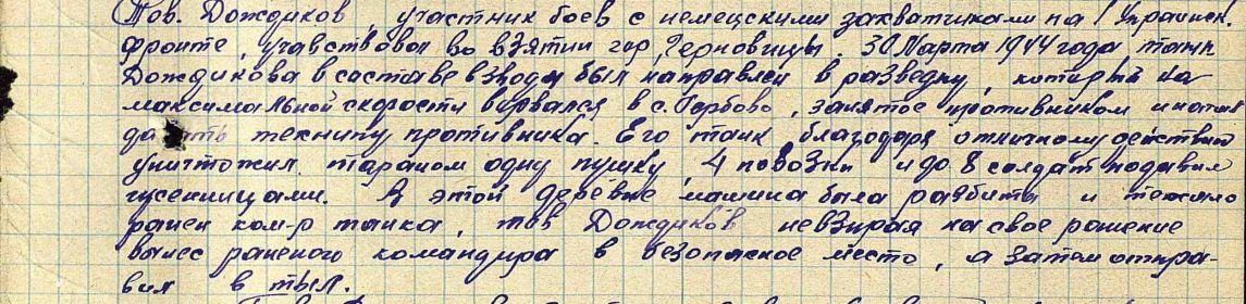 Дождиков Северьян Иванович родился 19 сентября 1914 года. Выучился на механика, работал по профессии, женился на Александре и в 1941 году у них родилась дочка Лия. 22 июня 1941 года - в первый день объявления войны Северьян вместе со своим братом Евгением явились на ближайший призывной пункт добровольцами, чтобы их отправили на фронт. Дома остались его жена Александра с 2-х месячной дочкой. Она окончила сельскохозяйственный техникум и работала агрономом. Трудилась в тылу и получила много наград за свой доблестный труд на благо победы. Работала в полях, огородах, выращивала хлеб и овощи для фронта. Всё лучшее тогда отправляли на фронт, приближая победу. А маленькую дочку Лию оставляла со своей бабушкой. У Северьяна до войны была профессия механика, поэтому он прошёл короткое обучение на базе лётного училища и был направлен бортмехаником в лётную часть, а его брат Евгений - в разведку. Северьян прошел всю Великую Отечественную войну от начала и до конца. Он был бортмехаником самолёта. Его отправили на аэродром Монино под Москвой - военный аэродром в 2 км юго-западнее станции Монино Московской области. Совершали вылет за вылетом, обороняя Москву. Когда не хватало пулемётчиков, Северьяну приходилось не только выполнять работу бортмеханика, но и совершать обстрелы по вражеским самолётам, стреляя из пулемёта. Однажды фашисты сбили самолёт, в котором находился Северьян. Самолёт разбился, Северьян чудом уцелел, его подобрали санитары, он получил тяжёлую контузию и ранения и долго лежал в госпитале. Потом снова вернулся летать, совершая вылет за вылетом. Северьян отважно защищал Москву и получил медаль за оборону Москвы. Однажды самолет Северьяна подбили и второй раз он пережил крушение самолёта и был снова контужен и едва выжил. После госпиталя его хотели демобилизовать и дать инвалидность, но Северьян добился, чтобы его оставили в армии. Идти в авиацию он уже не мог по здоровью, но прошел обучение на механика водителя танка "Т-34" и отправился на фронт в 3-ий танковый батальон 64-ой гвардейской танковой бригады. Ему дали звание гвардии старшина. 30 марта 1944 года его танк в составе взвода ворвался в с.Гербово, занятое противником и начал давить вражескую технику и солдат. В этой деревне машина была разбита и тяжело ранен командир танка, Северьян вынес раненого командира в безопасное место, а затем отправил в тыл. За этот подвиг он был награжден орденом «Красной звезды»! А как-то и самого Северьяна сильно ранило в танке и его спас товарищ. Потом снова госпиталь, и опять на фронт. Дождиков Северьян мужественно защищал нашу Родину, оборонял Москву! Победу встретил в Германии. За всю войну он дважды был контужен, 3 раза горел в танке. Получил множество медалей и орденов: орден «Красной звезды», орден «Красного знамени», орден «Отечественной войны I ст», памятный орден «25 лет победы», медали: «За отвагу», «За мужество», «За оборону Москвы», «За победу над Германией», «Ветеран труда» и другие. В 1946 Дождиков Северьян вернулся домой, когда его дочке уже было 5 лет. Очень трудно пришлось Дождиковым, да и остальным, жить и поднимать разрушенное войной хозяйство. Но все были счастливы, что кончилась война, а трудности не пугали. У Дождиковых родились еще дочка Евгения и сын Владимир. Дождиков Северьян умер 9 октября 1987 года в 73 года в Крыму в г. Феодосия.