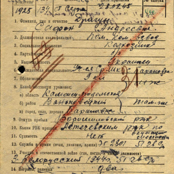 Место рождения Украинская ССР, Каменец-Подольская обл., Виньковецкий р-н, с. Барановка .Сейчас наз. Хмельницкая обл.Ярмолинецкий р-н .Украина.Дата и место призыва Летичевский РВК, Украинская ССР, Каменец-Подольская обл., Летичевский р-н.Воевал с 1943- го года и до конца войны.Был дважды ранен.Лежал в госпитале в Москве.Воинское звание-старший сержант Инвалид войны 2группы.Был награждён медалями и орденом(какие не знаем)Умер 8 февраля в 1979г .Призван в Украине . Воевал под Москвой ,в Литве.Знаем когда призывали года 2 или 3 накинули к году рождения т.е. в военных документах возможно год рождения 1925г.