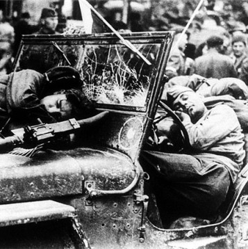 среди ликующей толпы. Снимок передан в Центральный музей вооруженных сил СССР из Чехословакии. Фото из
