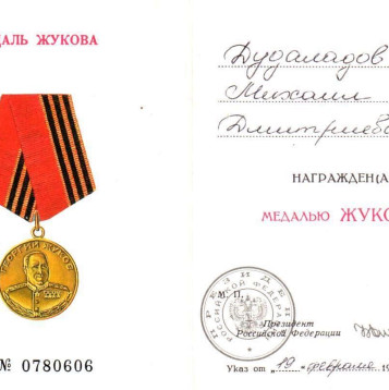 от 08 мая 1946 года,- «Орден Отечественной войны II степени» от 11 марта 1985 года,-«Медаль Жукова» от 19 февраля 1996 года.
