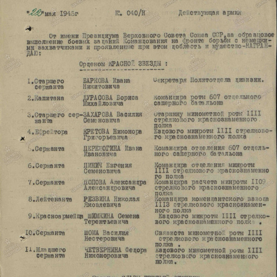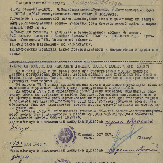 Дата рождения - 1920. Место призыва Ухтомский РВК, Московская обл., Ухтомский р-н. Воинская часть 607 осапб 330 сд. Дата поступления на службу -1940. Наименование награды: Орден Красной Звезды. Даты подвига: 23.04.1945- 24.04.1945, 26.04.1945-27.04.1945. Номер фонда ист. информации 33. Номер описи ист. информации: 687572. Номер дела ист. информации 1156. Архив ЦАМО.