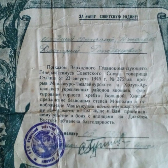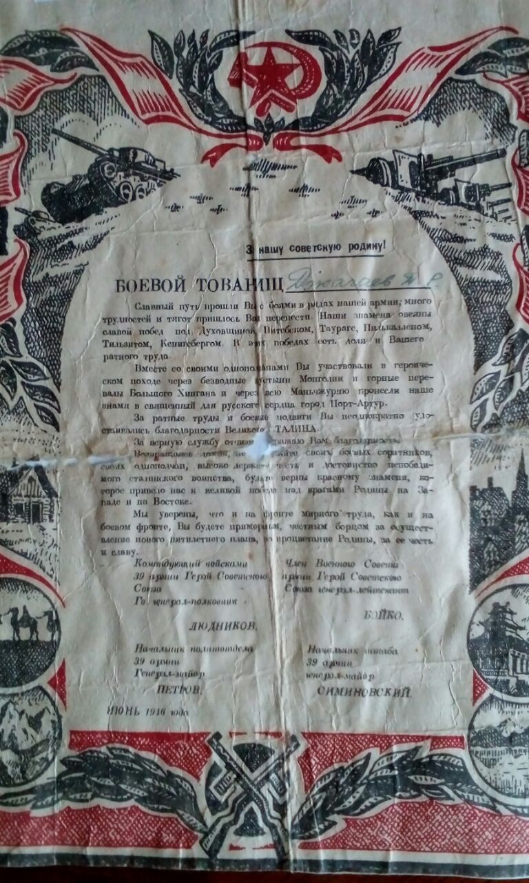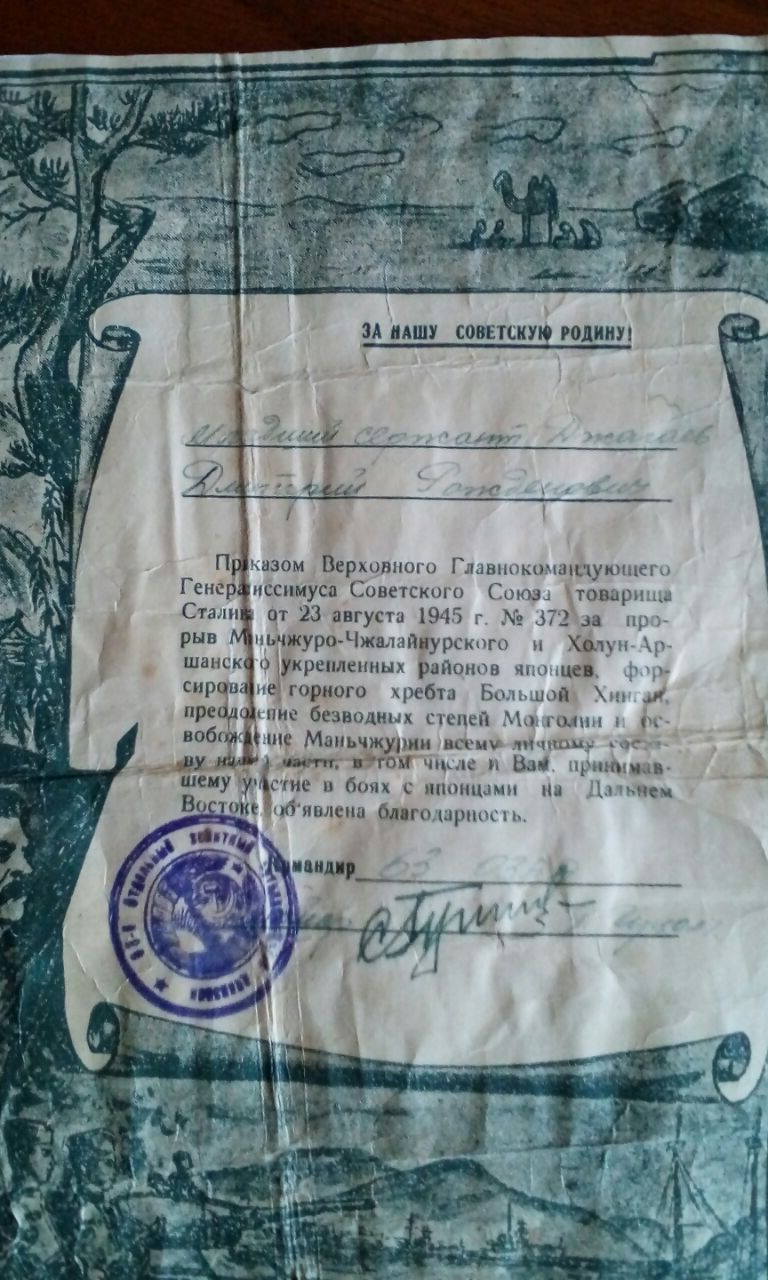 Принимал участие в прорыве Маньчжуро-Чжалайнурского и Холун-Аршанского укрепленных районов японцев,форсирование горного хребта Большой Хинган,а так же,преодоление безводных степей Монголии и освобождение Манчжурии.Героический поход был закончен в священном для русского сердца городе Порт-Артур.