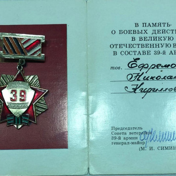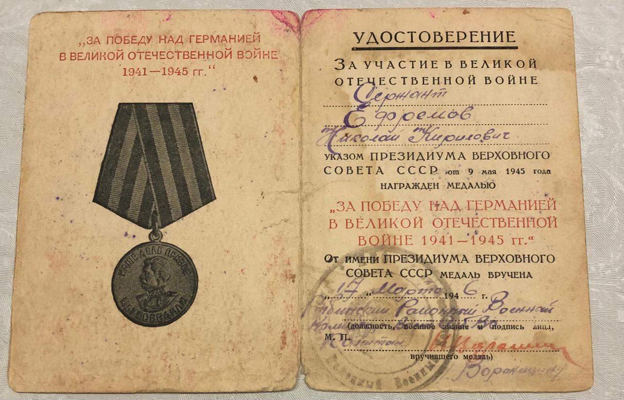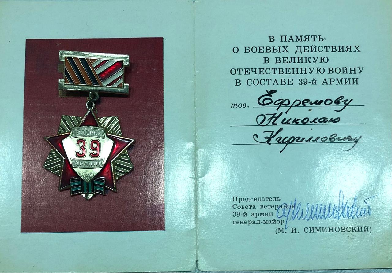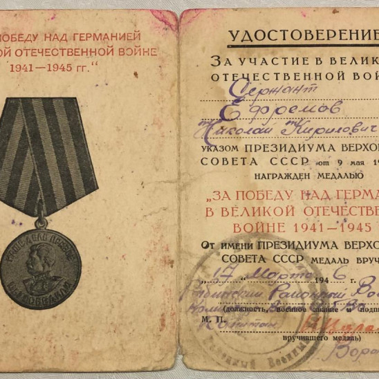 [23.02, 15:10] Таня: В преддверии 80-й годовщины Великой ответственной войны я хочу рассказать о своём прапрадедушке Ефремове Николае Кирилловиче. О нём мне рассказала мама, она его правнучка. Николай Кириллович родился 2 мая 1911 года в деревне Орловка Красноярского края. 29 мая 1941 года прадедушка был призван Рыбинским районным военкоматом Красноярского края на службу в Красную армию. На тот момент он был уже женат на прапрабабушке Тане и у них было уже трое детей: мой прадедушка Ваня ( он папа моего дедушки), ещё Алексей и Галина. После войны родился ещё Юра.Прадедушка служил в 15 отдельной роте охраны Управления 31 Армии в звании младшего сержанта. В 1942 году ему было присвоено звание сержанта, он показал себя лучшим бойцом и отличником по боевой и политической подготовке, был выдвинут на должность командира отделения зенитно-пулеметного взвода. Приказом от имени президиума Верховного совета Союза ССР номер 543 Николай Кириллович был награжден медалью "За боевые заслуги". С 31-ой Армией Николай Кириллович прошёл боевой путь от Ржева, Торжка и Твери до Германии. 7 сентября 1945 года он был демобилизован и вернулся в свою родную Орловку. В декабре 1985 года умерла прабабушка Таня и прадедушка Коля переехал в город Зеленогорск в однокомнатную квартиру. Умер он 16 февраля 1997 года. Как я уже писал, у прадедушки Коли и прабабушки Тани было 4 детей и 7 внуков.