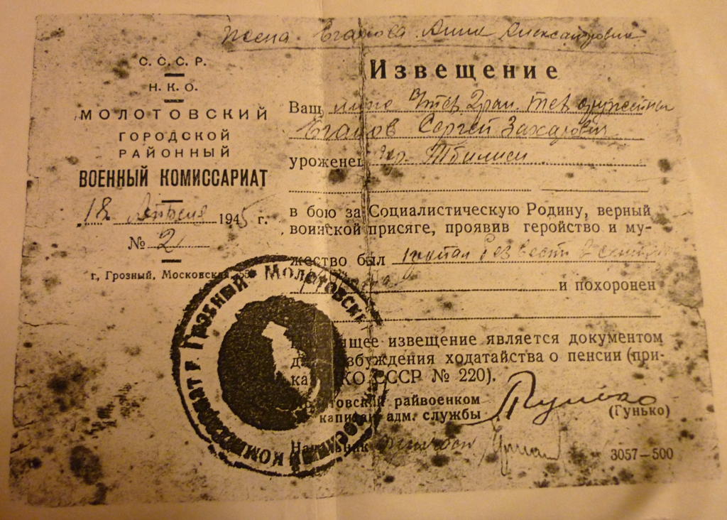 Еганов Сергей Захарович воевал в войсковой части 641 составного полка 165 стрелковой дивизии военным техником 2ранга. Он участвовал в боях за оборону г. Киева, в районе Дарницы попал в окружение вместе с товарищами и в сентябре 1941 года пропал без вести... В первых письмах он писал жене: «Анечка, какой красивый город Киев, после войны мы обязательно переедем сюда жить!»... Он верил в победу и отдал свою жизнь за освобождение Киева. Ей было 27 лет, и она осталась с двумя малыми детьми в эту страшную военную пору... Всю жизнь она ждала и любила мужа, как живого, до самой смерти.Нелегкая судьба выпала Анне Александровне, сполна она испытала тяготы военных лет, много слез пролила над извещением, преодолевая трудности военной и послевоенной жизни, одна воспитывая двоих детей.