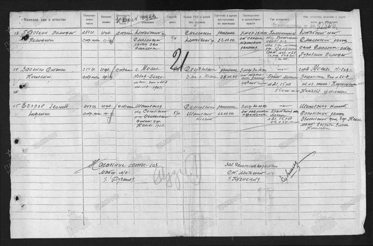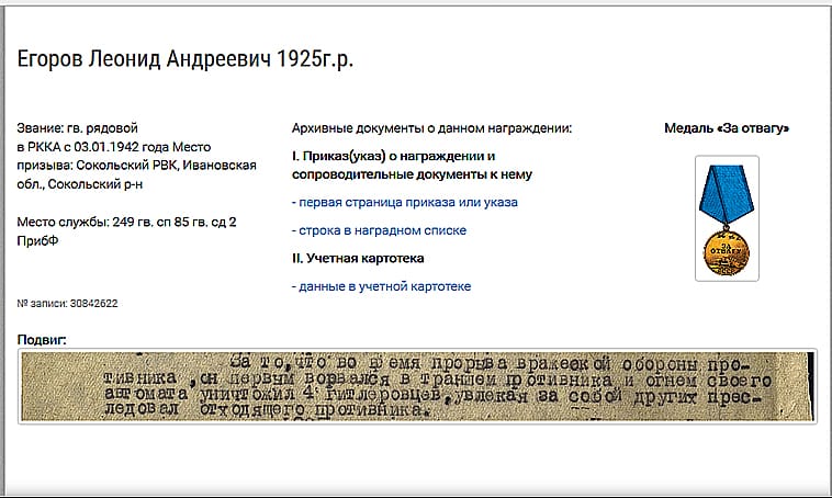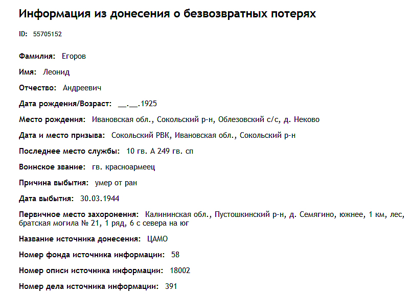 Гвардии красноармеец (рядовой) Егоров Александр Андреевич родился в 1925 году в д.Неково Облёзовского с/с Сокольского р-на Ивановской обл. Проживал там же. Призван на службу Сокольским РВК Ивановской (ныне Нижегородской) обл. 08.01.1943 г. Воевал в составе 249 гв. сп., 85 гв. сд.,10 гв.А 2 ПрибФр. Награждён медалью "За отвагу". Умер от боевого ранения 30.03.1944 г.. в госпитале ХППГ 103. Захоронен в братской могиле №21 в лесу 1 км южнее д. Семягино Пустошкинского р-на Калининской (ныне Тверской) обл.Мать - Егорова Елена Николаевна. Брат Егоров Александр Андреевич погиб на фронте 03.08.1942 г. Трое сестёр и младший брат Егоров Виталий Андреевич1927 г.р.