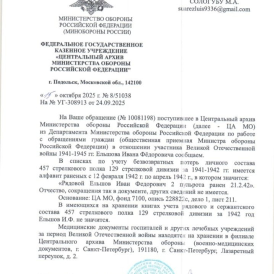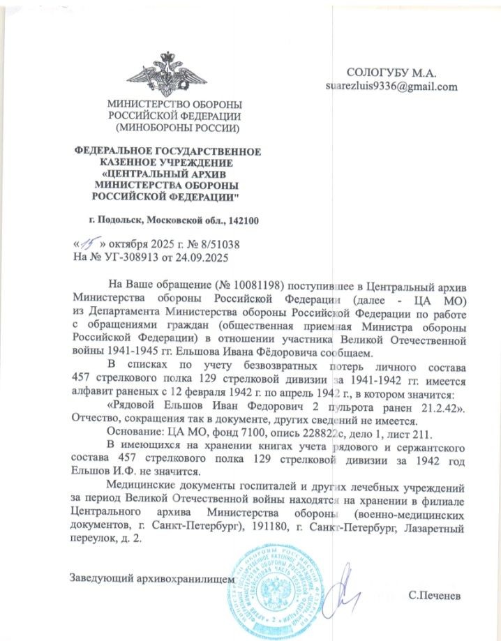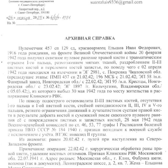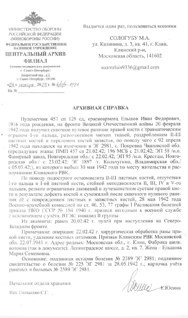 Поэтому я тогда подумал, что это просто однофамилец. В течение трех лет я потихоньку пытался найти информацию о нем, но она так и не находилась. В августе 2025 года я уже в отчаянии решил снова посмотреть страницу, о которой говорилось выше. Посмотрев внимательно документы, я заметил одну странность: данный человек погиб в феврале 42-го года, а в следующих документах выписывается из госпиталя в мае 42-го года. Для того чтобы убедиться, мой ли это прадед, я начал смотреть список захоронений погибших солдат Великой Отечественной в Старорусском районе и не нашел в этом списке Ельшова Ивана Федоровича. А потом посмотрел список безвозвратных потерь 129-й стрелковой дивизии, в котором тоже не было указано, что данный человек погиб. Из этой информации я понял, что это мой прадед Ваня, которого я так долго искал и наконец-то нашел.