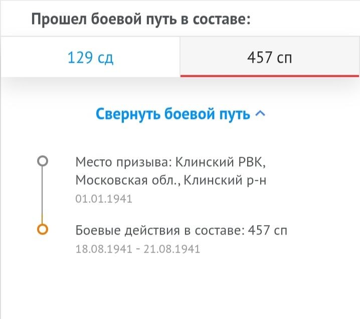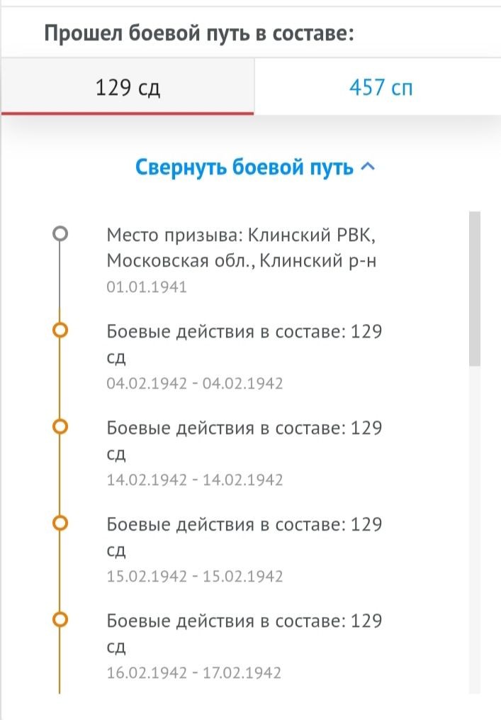 Из этого можно сделать вывод, что когда в документе составляли список безвозвратных потерь, моего прадеда перепутали с другим человеком. Кроме документа, который я цитировал выше, есть еще документ ЦАМО, подтверждающий данную информацию. В нем указано следующие: " в списках по учету безвозвратных потерь личного состава 457 стрелкового полка 129 стрелковой дивизии за 1941-1942 гг. имеется алфавит раненых с 12 февраля 1942 г. по апрель 1942 г. в котором значится:
