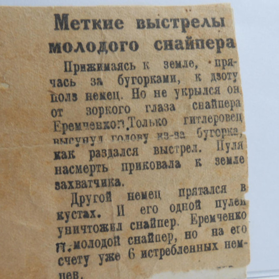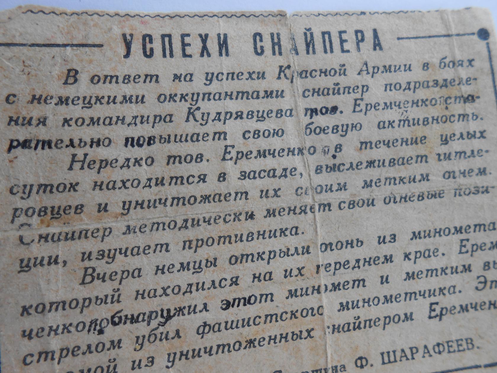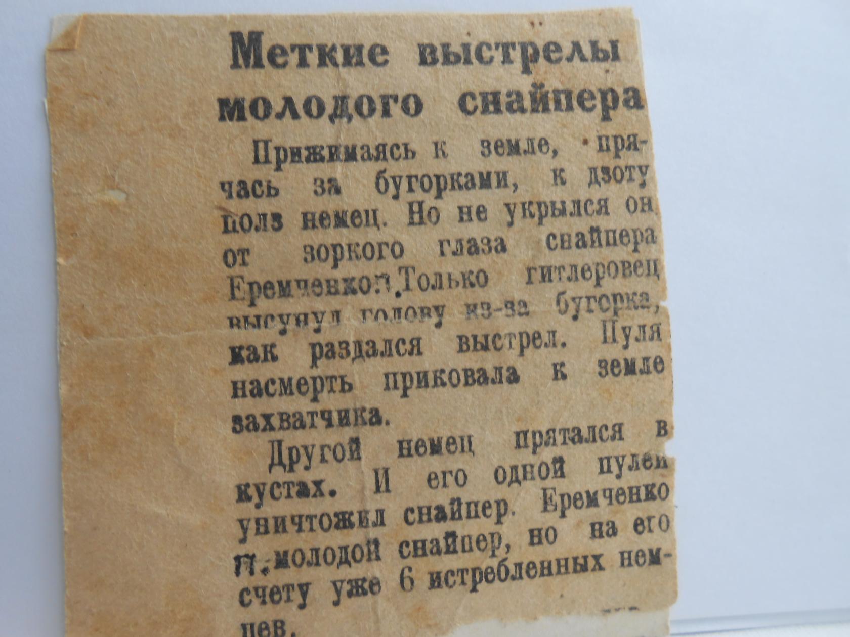 Был призван в 1942 году. До призыва работал ветеринаром. В годы войны П.С.Еремченко был снайпером подразделения командира Кудрявцева.Он нередко в течении целых суток находился в засаде, выслеживал гитлеровцев и уничтожал их своим метким выстрелом. К сожалению был ранен в бою немецким снайпером в ногу. После чего был направлен в госпиталь, а затем в тыл, где продолжал работать ветеринаром.