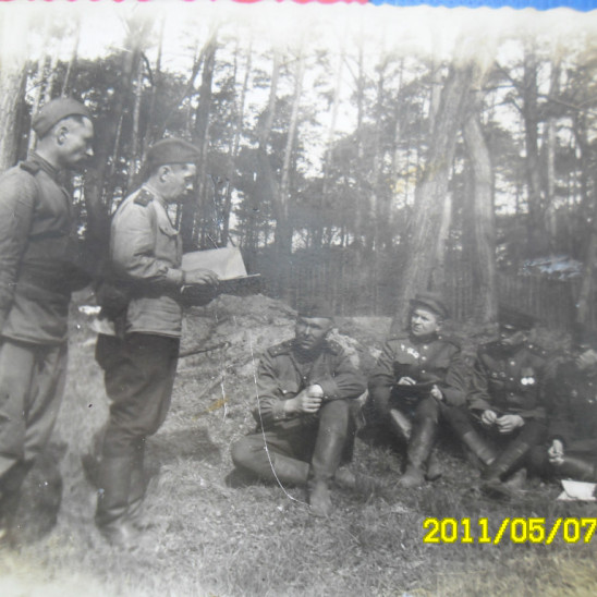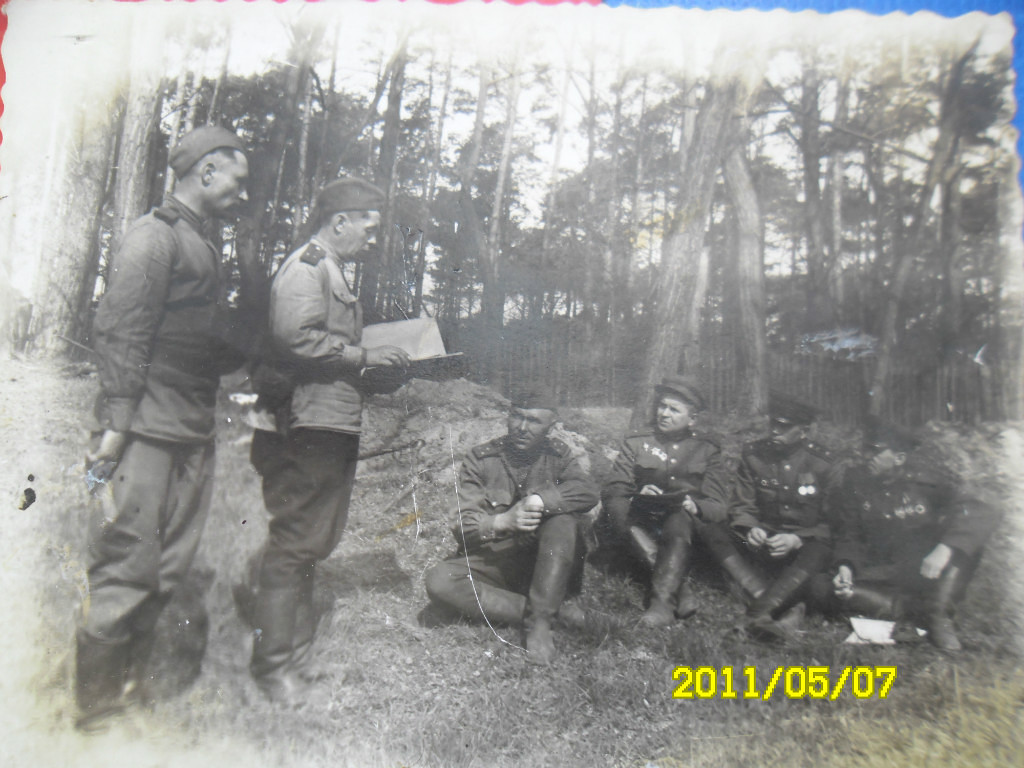 С НАДПИСИ НА ФОТО: " После сильных боев и перед сильными окончательными боями, под редким артеллерийским обстрелом в 40 км от Берлина(Леббин). Мстим врагам за смерть братьев , товарищей и друзей .2.04. 45г. Из далекой Германии ,на добрую память родным." С НАДПИСИ НА ФОТО: Встреча Михаила Петровича и Петра Петровича Еремеевских в суровые дни Отечественной войны 1944г 12 октября ,невиделись 8лет. Третье фото: Мой дед Еремеевский П.П. 10 августа 1945г Польша.