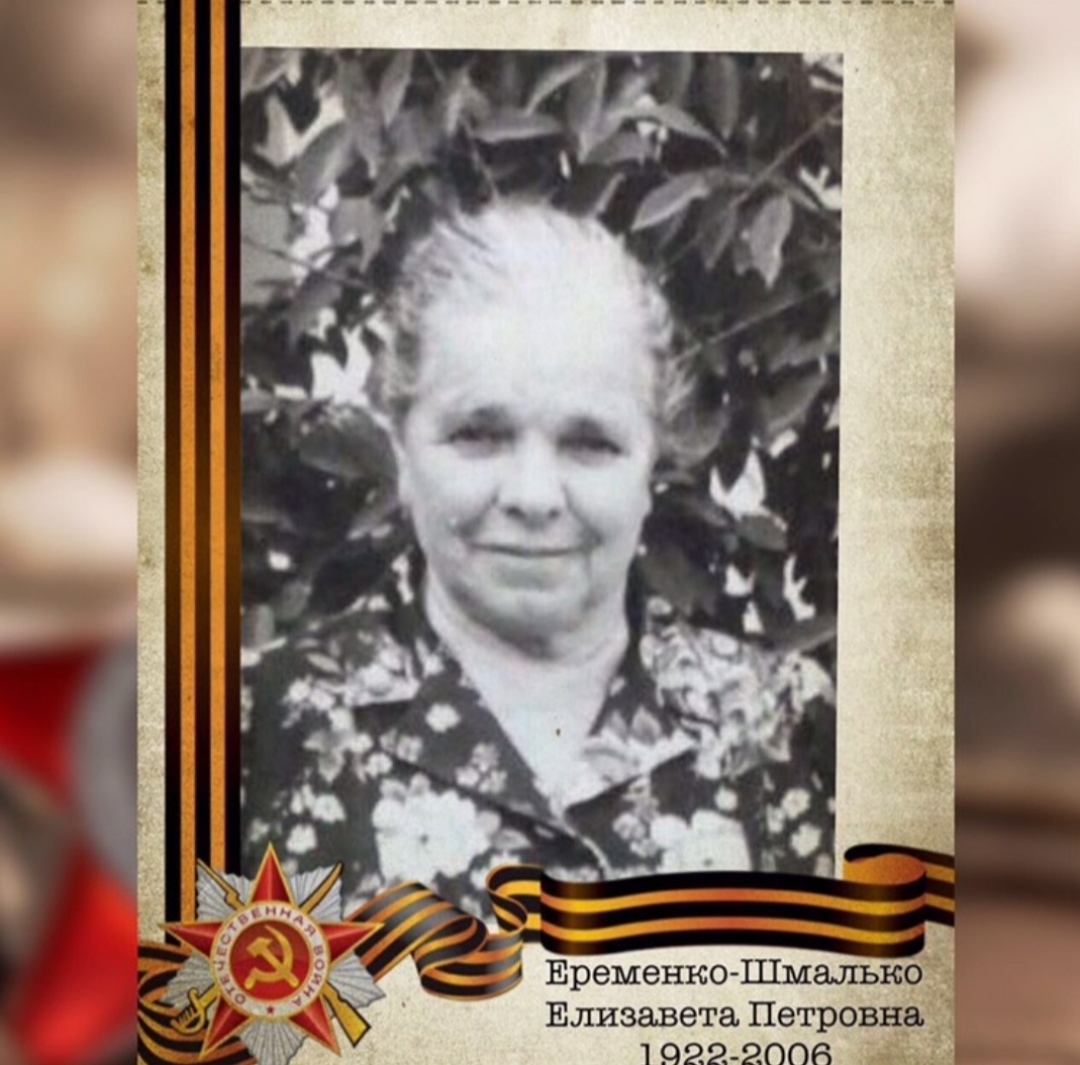 Моя бабушка Елизавета Петровна была тружеником тыла. Работала в госпитале на подвозе,на лошадях. Её все звали Лида....поэтому никакой информации о Елизавете Петровне нет и ничего ей не полагалось... Редко,но рассказывала со слезами на глазах,о том сложном времени... После войны вышла замуж за Шмалько Антона Яковлевича,растили 5 детей....затем внуков,правнуков. Жили скромно, работала,занималась хозяйством,огородом.Всегда старалась накормить внуков.Вкуснее бабушкиных вареников нет ничего на свете.... Умерла бабушка в 84 года ...