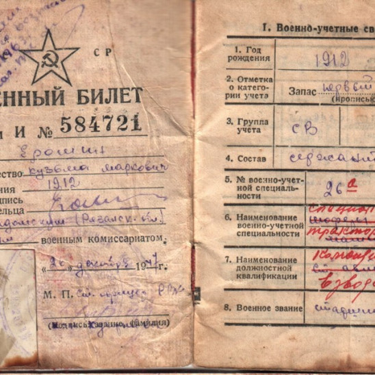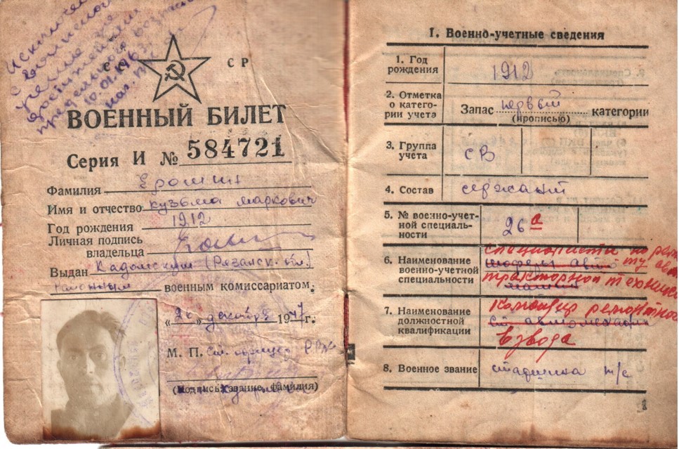 билет был выдан Ерошину К.М. Кадомским районным военным комиссариатом Рязанской