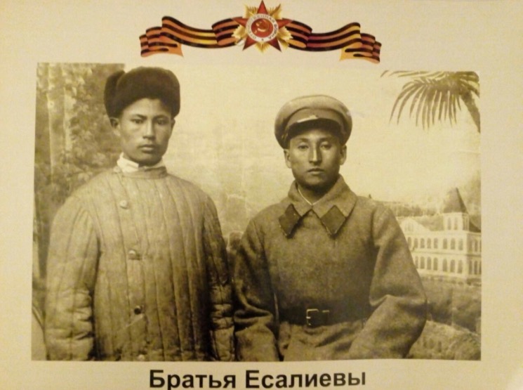 Боевой путь ветерана Есалиев Кабдреш Ергалиевич, 1917 года рождения. В Астраханском кремле закончил срочные курсы офицеров.Командир пулемётной роты,звание: лейтенант. Первый бой принял под Москвой.Пропал без вести в октябре 1941 года. На фото Газиз провожает брата Кабдреша на фронт.