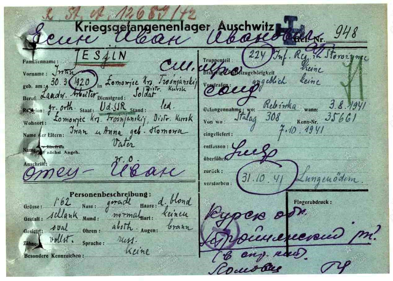 В довоенное время Есин Иван Иванович занимался сельским хозяйством в колхозе им. "Будённого" Орловской (Курской) обл., Троснянского р-на. По имеющимся сведениям, которые находятся в ЦАМО Есин Иван Иванович, был пленён. Дата пленения - 03.08.1941 года. Место пленения - село Репьевка, Воронежская область. Находился в лагере - шталаг VIII E (308). Лагерный номер его - 35661. Причина выбытия - погиб в плену. Место захоронения - Аушвитц (Освенцим).