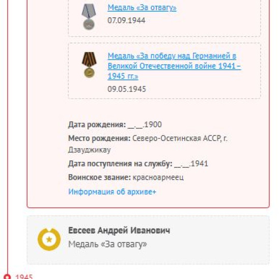 Евсеев Андрей Иванович (14.10.1900-15.12.1975) Родился 14 октября 1900 года в Северо-Осетинской АССР, г. Дзауджикау (ныне г.Владикавказ). До революции жили хорошо: были свои стада коров, лошадей, всякой живности. Имел 13 братьев и сестер. К сожалению, некоторые умерли от заболеваний в детском возрасте, кто-то не пережил голод 1932-1933 годов, а на войну с дедушкой Андреем ушли его 7 братьев. 28.09.1941 годы был призван в Северо-Осетинской АССР, г. Орджоникидзе. Место службы: 1382сп 87 стрелковая дивизия 55СК 2Гв.А 4УкрФ, Орджоникидзевский РВК, Северо-Осетинская АССР. На момент призыва было 4-ро детей, работал слесарем, беспартийный. Рядовым Красноармейцем в составе 1382 стрелкового полка 87 СД 55го стрелкового корпуса 2 Гвардейской Армии 4 УкрФ прошел всю войну до Европы, домой вернулся в 1947 году после восстановления Европейских городов. Из крупных сражений, изменивших ход войны, участвовал: - в августе 1942 году в Битве под Сталинградом. Оборона советских войск. 12.7-18.11.42 г., - в конце августа 1943 г. участвовал в операции по Освобождению Донбасса (18.8-22.9.43 г.), - в октябре 1943 в Мелитопольской операции (прорыв на р. Молочная 26.9-5.11.43 г.), - в августе 1944г. в Шауляйской наступательной операции и отражении контрударов противника в районах западнее и северо-западнее Шауляй. 17.7-28.8.44 г. (Операция 5-го удара). За время войны бабушке приходило 2 похоронки в январе 42 как о погибшем в боевых действиях под Сталинградом и в августе 1944 как о пропавшем без вести в Латвийской ССР, Гольби, в районе Шауляй. В третий раз бабушка оплакивала мужа в 1945, когда дедушка не вернулся после Победы. История умалчивает по каким причинам не сообщал о своем местоположении и состоянии, но домой дедушка вернулся в 1947 году после восстановления Европы и прожил до 15 декабря 1975 года. Награжден 09.05.1945 г. Медалью «За победу над Германией в Великой Отечественной войне 1941–1945 гг.» и 07.09.1944 г. Медалью «За отвагу» Любим, гордимся!