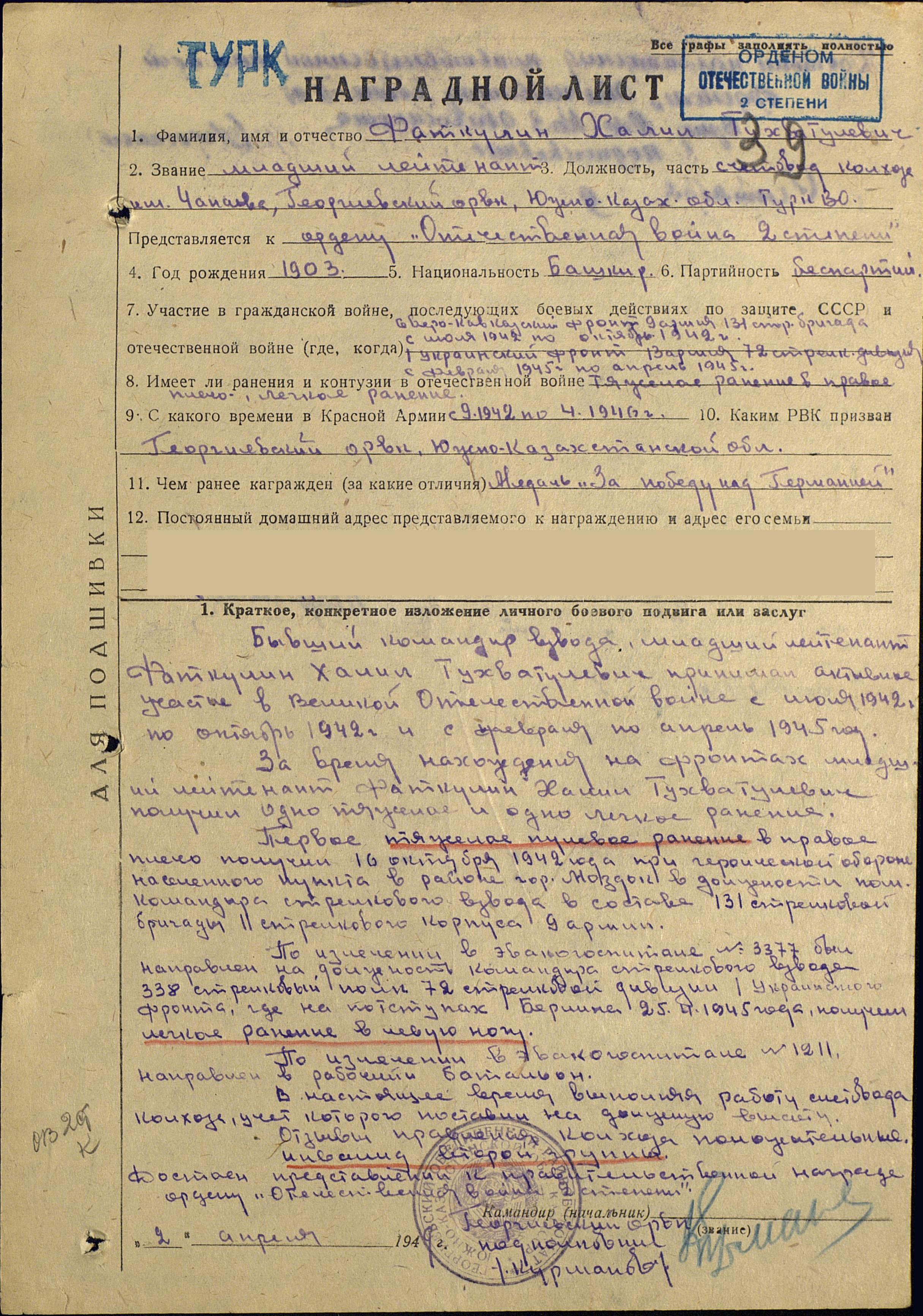 Тухватуллаевич принимал активное участие в Великой Отечественной войне в