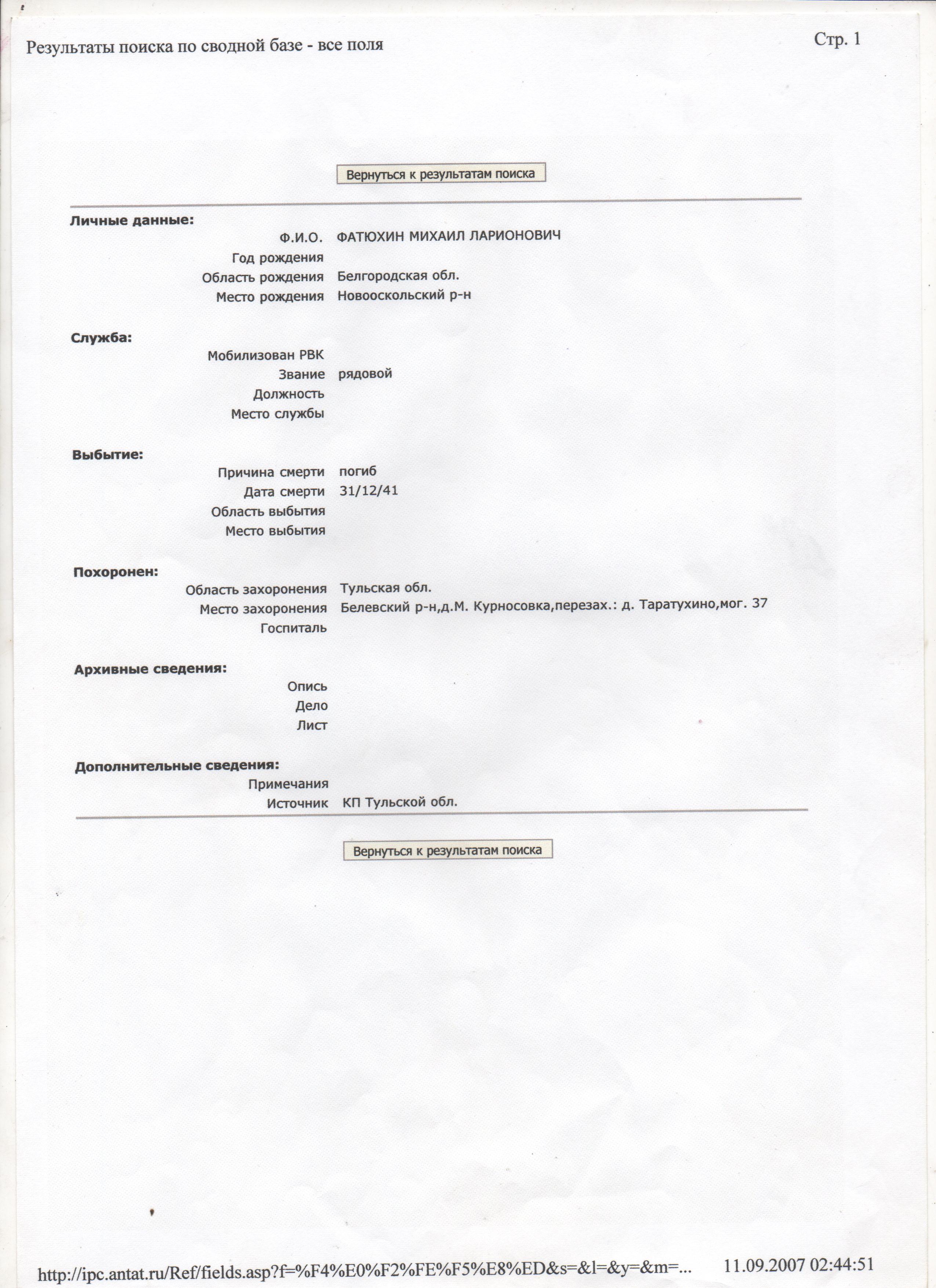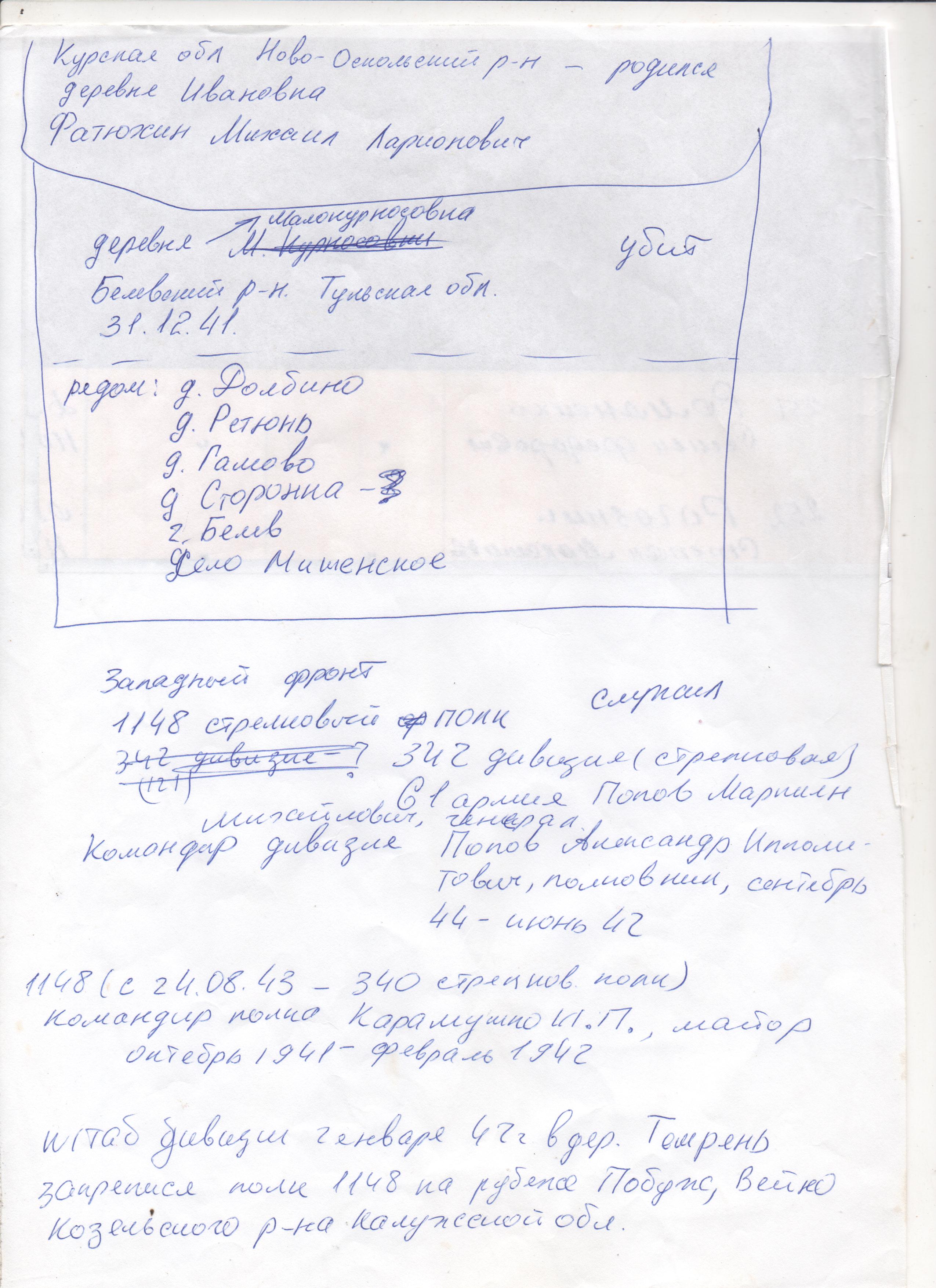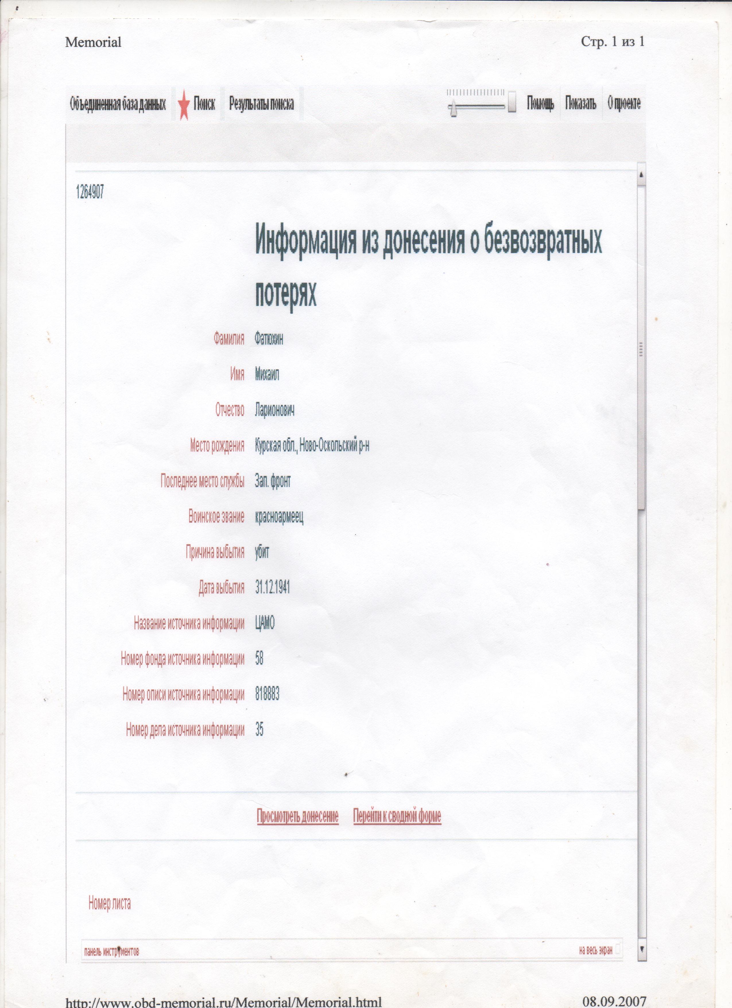 Погиб 31.12.1941г. Тульская обл. Белевский район, деревня Малая Курносовка. Перезахоронен