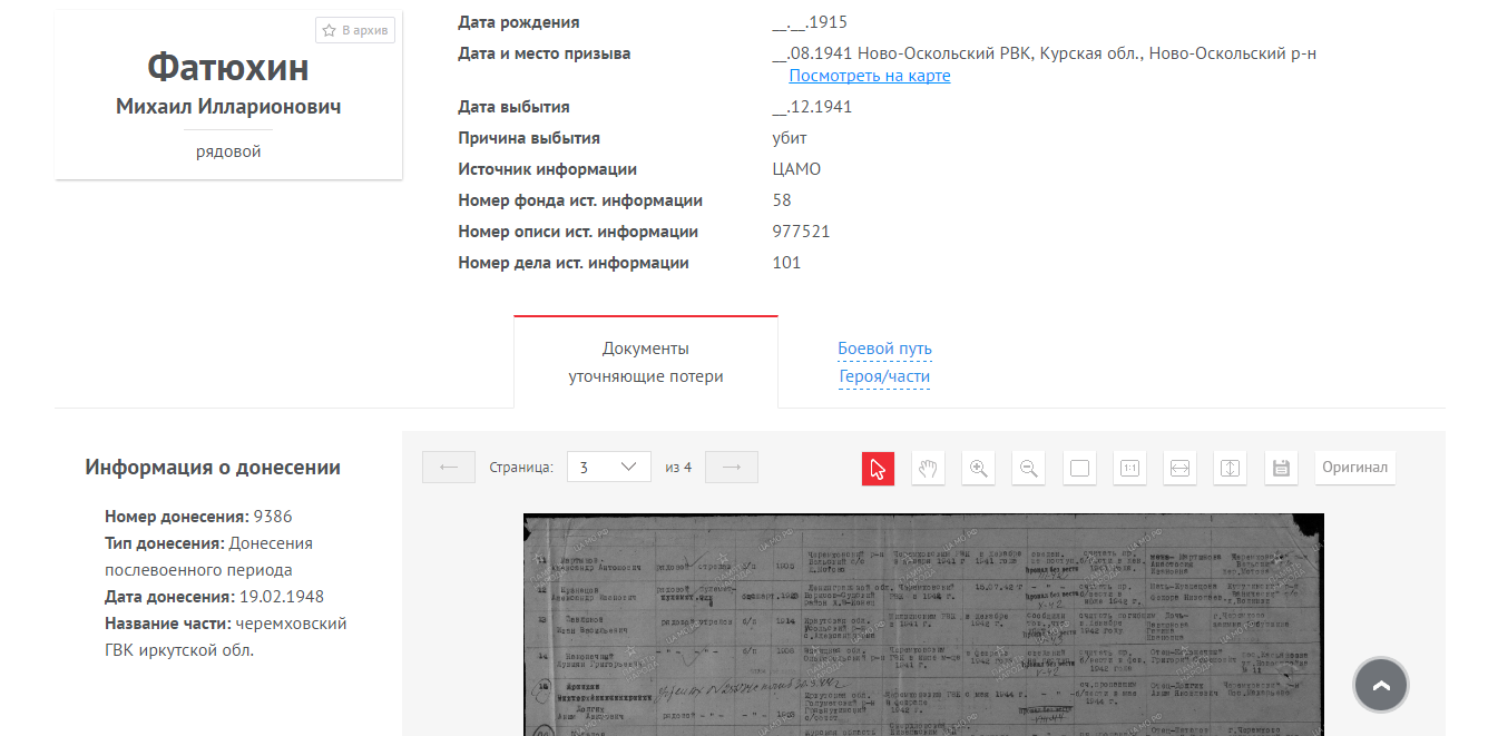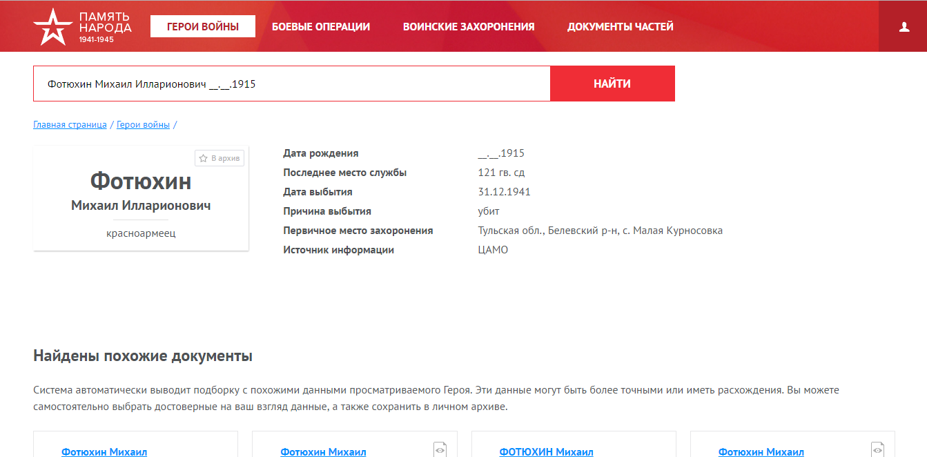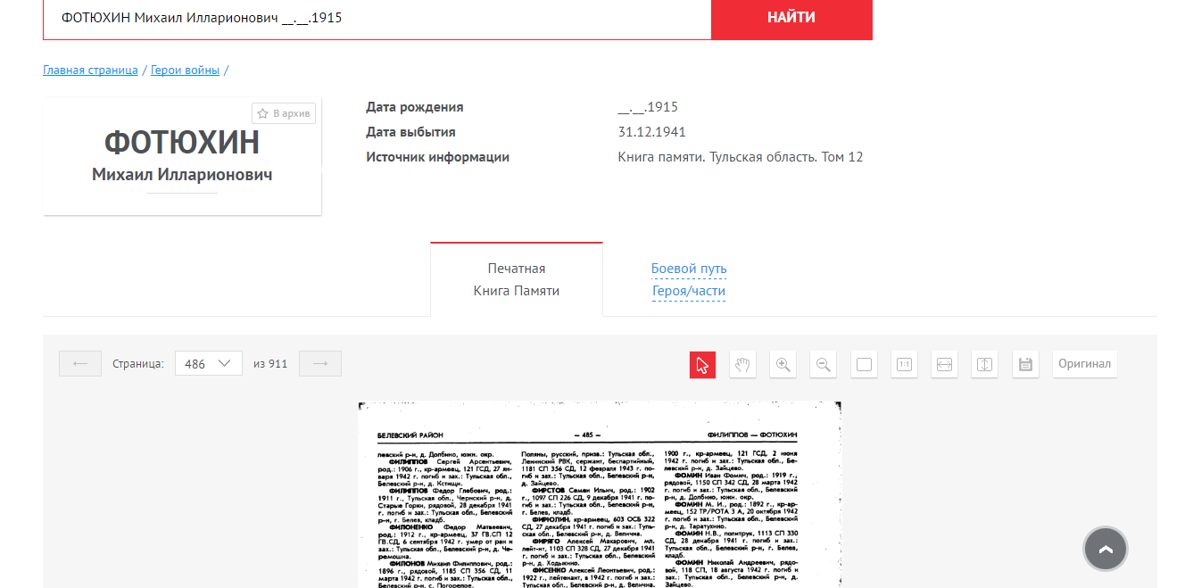 Погиб 31.12.1941г. Тульская обл. Белевский район, деревня Малая Курносовка. Перезахоронен