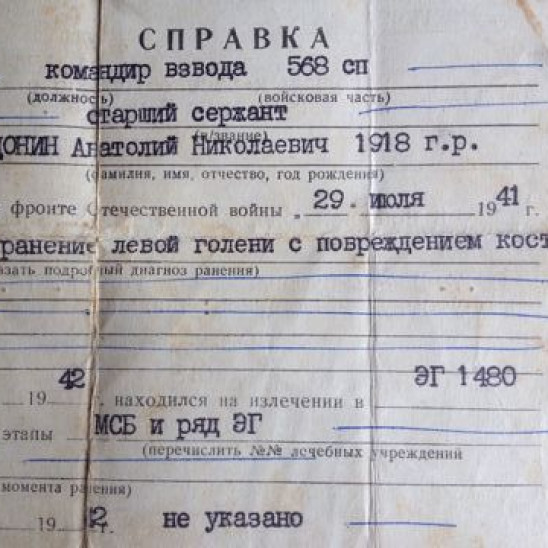Мой отец Федонин Анатолий Николаевич 1918г рождения призван на военную военную службу 24 октября 1938 года в г. Валуйки где в 1940 году на базе стрелкового батальона был сформирован 568 стрелковый полк который был включен в состав 149 СД которая уже существовала с 1937 г в г. Острогожске. К началу июня 1941г формирование149 дивизии завершалось в Коротоякском лесу куда она была собрана на летние учения там и застала весть о начале войны. 26 июня 1941 года в г. Валуйки дивизия погрузилась в эшелоны и двинулась по маршруту Острогожск- Воронеж-Елец-Ефремов-Волово -Горбачево- Сухиничи. Выгрузка производилась близ станции Спас-Деменск, что южнее Ельни. Там уже шло тяжелое Смоленское оборонительное сражение1941г.Будучи пом. ком взвода в наступательном бою в 15 километрах от г. Калуги в 1942 году мой отец получил осколочное ранение левой голени и был отправлен в Эвакогоспиталь №1480. После чего ему ампутировали ногу. После войны отец работал в колхозе в с.Кропотово. Умер 15 октября 1978г.