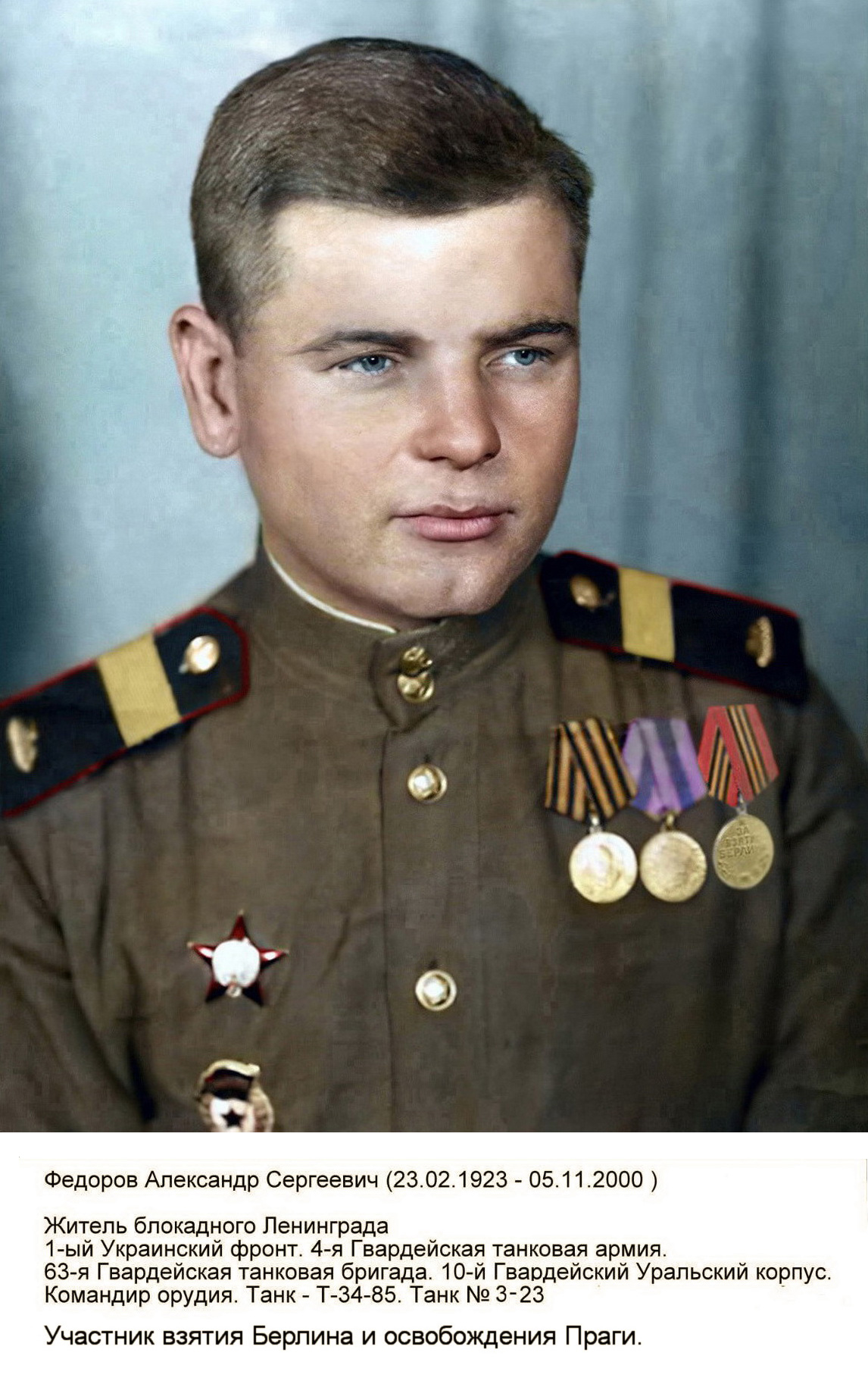 Мой отец, житель блокадного Ленинграда. Учился в Ленинграде в 5 РУ. 1942 году был эвакуирован на Урал в Челябинск. Работал на Челябинском тракторном заводе, в 1943 году 16 января написал заявление о вступлении в добровольческий танковый корпус и был зачислен 26 учебный курсантский полк. В июне 1944 года призван Кировским РКК города Куйбышев на фронт. Участник Берлинской и Пражской операций.