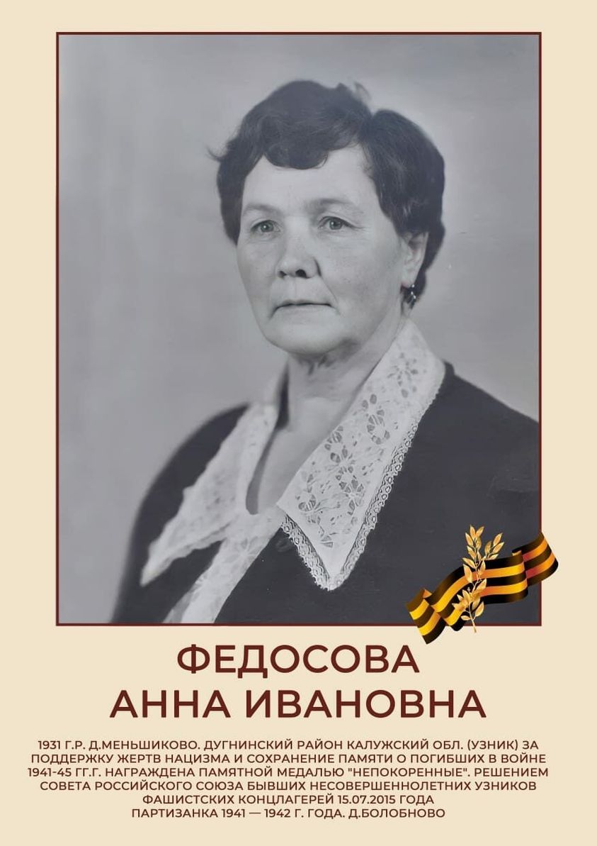Анна Ивановна - труженик тыла, партизанка. После работы в тылу Вместе с мамой Сазоновой Еленой Владимировной (1910 гр.) и братом Иваном Мордановым,ночью выводили из другой деревни Партизан. Брата Ивана немцы поймали: зверски казнили, вырезали звезду,лишили глаз,сняли череп.Трижды Ферзиковский райвоенкомат эксгумировал. Составили протокол, выпустили Газету. На этом все закончилось. Памятник Ивану Морданову я поставила сама в той деревне Меньшиково,которой немцы его казнили. После войны правды не добились от райвоенкомата. Эксгумировали,г азету выпустили - на этом все закончилось. Оставшиеся дети стали разъезжаться из деревни. т.к немцы тремя гранатами ,которые бросили в печь, взорвали наш дом. Остались родители и дети,которые родились после В.О.Войны.