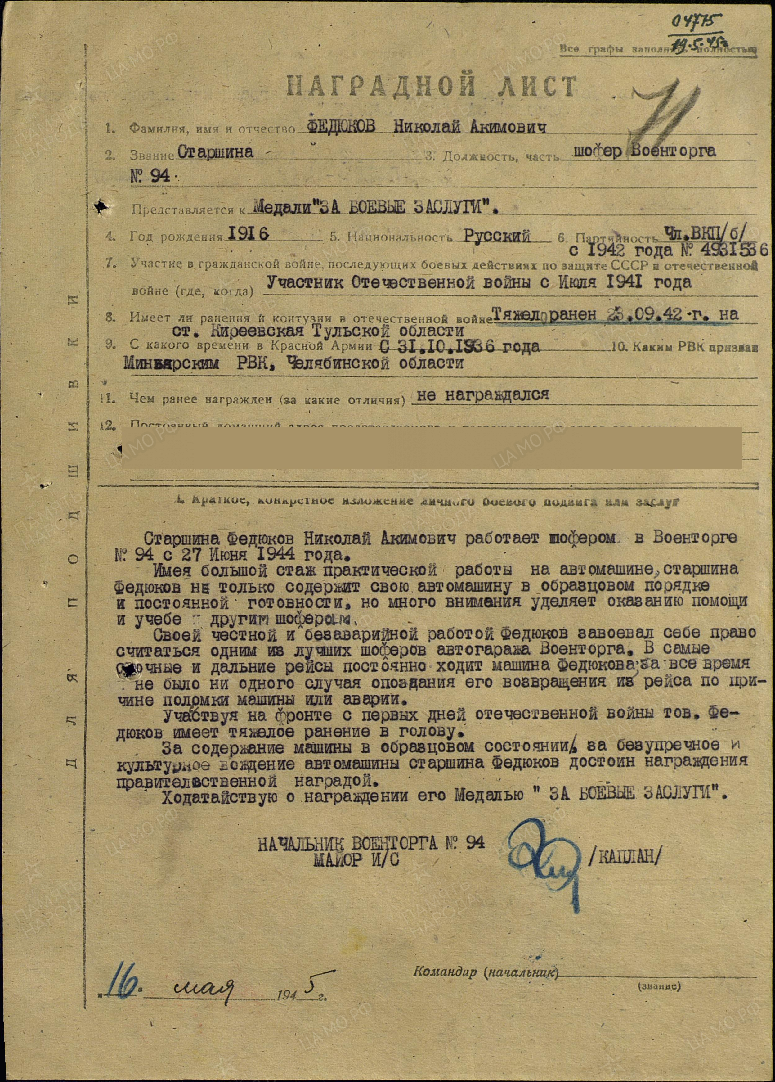 Место призыва: Миньярский РВК, Челябинская обл., Миньярский р-н
