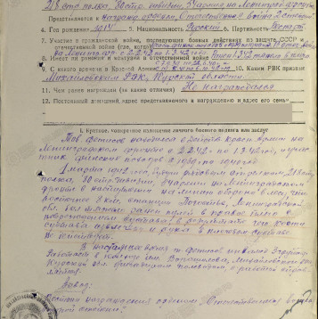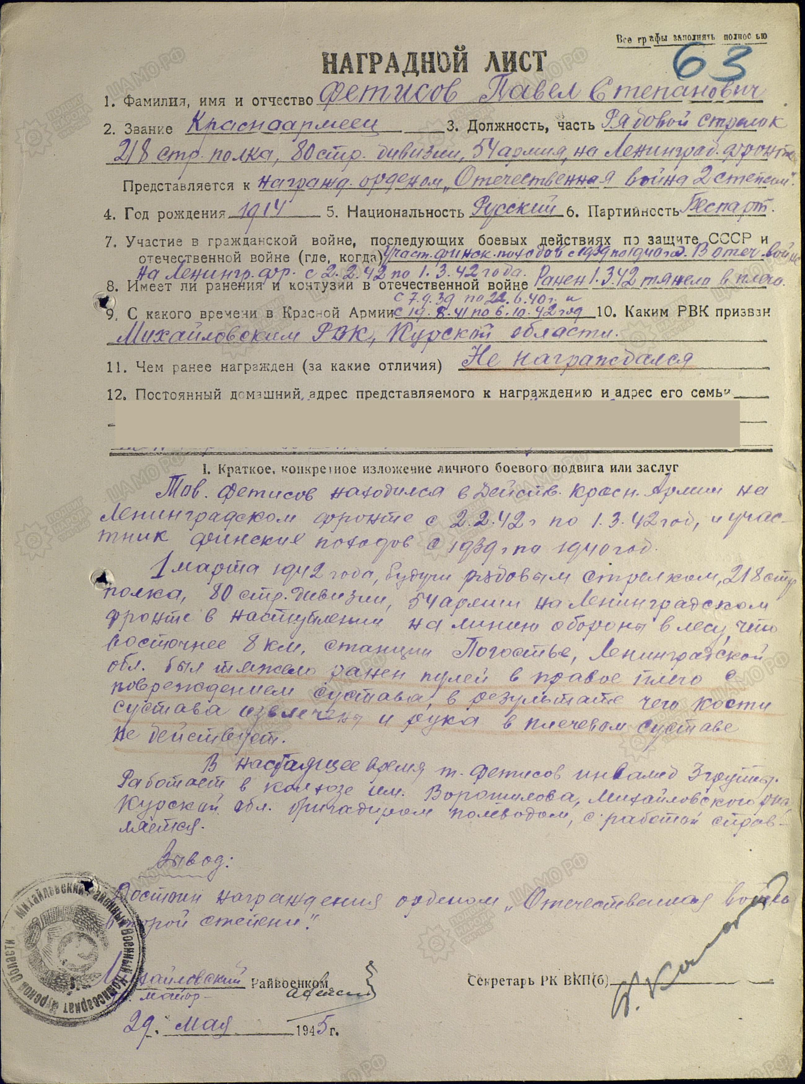 В ВОВ с 19.08.1941- 6.10.1942 г, был призван Михайловским РВК, Курской обл., Михайловского р- на, д. Капёнки. Имел звание красноармеец.1 марта 1942, будучи рядовым стрелком 218 СП 80 СД 54 А ЛенФ в наступлении на линию обороны, что восточнее 8 км от станции " Погостье" Ленинградской обл., был тяжело ранен пулей в правое плечо с повреждением сустава. В результате чего кости из сустава были извлечены и присвоена инвалидность 3 группы.