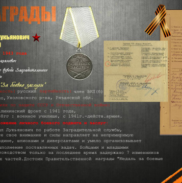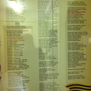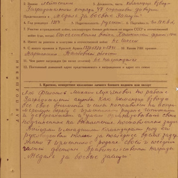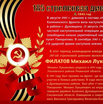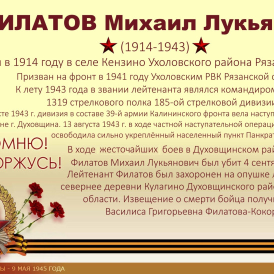 Михаил Лукьянович Филатов родился в 1914 году в селе Кензино Ухоловского района Рязанской области в семье Лукьяна и Василисы Филатовых. В 1936-38гг учился в военном училище. Призван на фронт в 1941 году Ухоловским РВК Рязанской области. C 1941 воевал на Калининском фронте в составе Красной Армии. Весной 1943 года командовал взводом заград-отряда 47-ой стрелковой дивизии. В мае 43-ого был удостоен Правительственной награды "Медаль за боевые заслуги". К лету 1943 года стал командиром взвода 1319-ого стрелкового полка 185-ой стрелковой дивизии. Принимал активное участие в боях при г.Духовщина Смоленской области и взятие населенного пункта Панкратово, за что в последствие вся дивизия была удостоега ордена Александра Суворова II-ой степени. Убит в бою 04/09/1943. Похоронен на опушке леса, что в 1км севернее деревни Кулагино Духовщинского района Смоленской области. Извещение о смерти бойца получила его мать Василиса Григорьевна Филатова-Кокорева. Михаил Филатов призван на фронт в 1941 году Ухоловским РВК Рязанской области.С 1941 участвовал в боевых действия на Калининском фронте. Весной 1943 года командовал взводом заград-отряда 47-ой стрелковой дивизии. В мае 43-ого был удостоен Правительственной награды "Медаль за боевые заслуги". К лету 1943 года стал командиром взвода 1319-ого стрелкового полка 185-ой стрелковой дивизии. Принимал активное участие в боях при г.Духовщина Смоленской области и взятие населенного пункта Панкратово, за что в последствие вся дивизия была удостоега ордена Александра Суворова II-ой степени. Убит в бою 04/09/1943. Похоронен на опушке леса, что в 1км севернее деревни Кулагино Духовщинского района Смоленской области.Мы помним и гордимся! Собрать информацию о погибшем солдате удалось лишь в 2015 году. Благодаря акции "Лента Памяти", которая проходила в московских школах в 2015 году, имя лейтенанта Филатова М.Л. было увековечено на Стене Памяти в Музее Боевой Славы школы № 1739 г.Зеленограда.