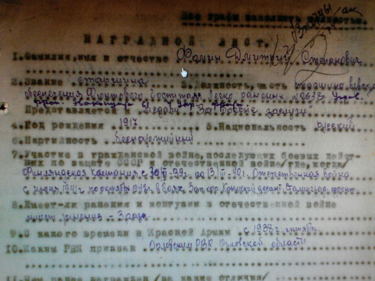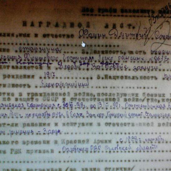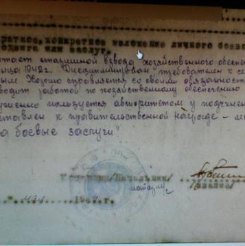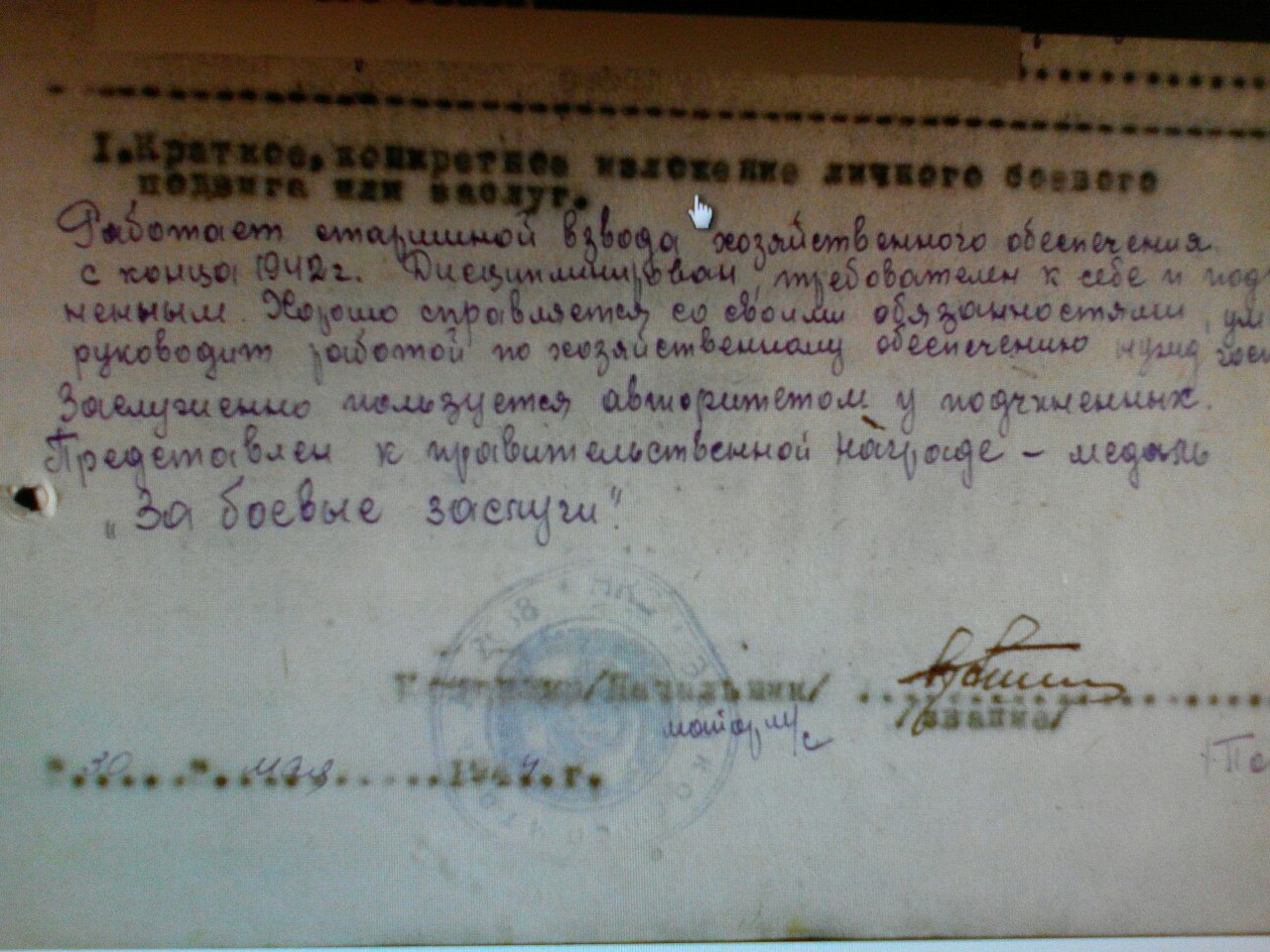 награжден орденом "Красной звезды" Фронтовой приказ№: 214/н от: 15.07.1944 Издан: ВС 4 Украинского фронта