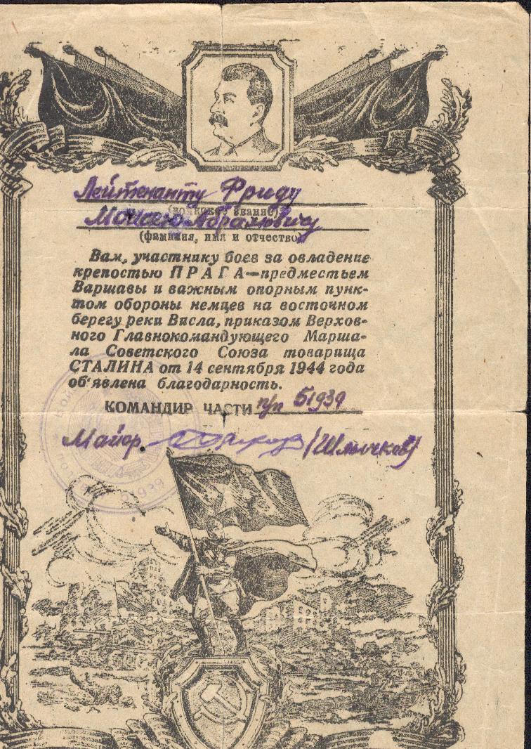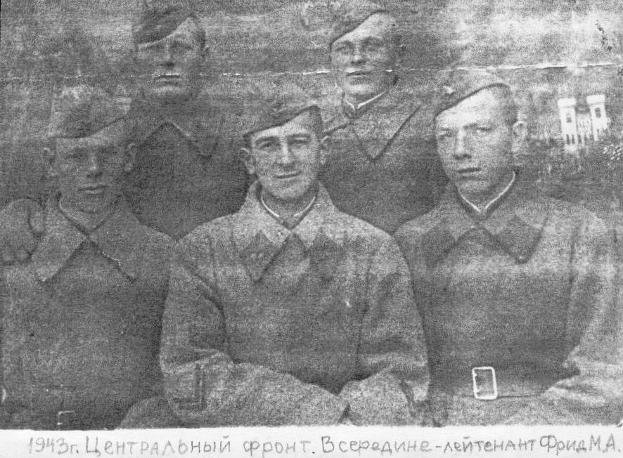 Мой отец Фрид М.А., пошёл добровольцем в Красную армию в июне 1941г., окончив первый курс Ленинградского кораблестроительного института. Был направлен на обучение в Омское зенитное училище, после окончания которого направлен в действующую армию. Участвовал в боях на Курской дуге, в освобождении Белоруссии, войну окончил в 1944г. в звании старшего лейтенанта в предместье Прага на правом берегу р. Вислы (Варшава).