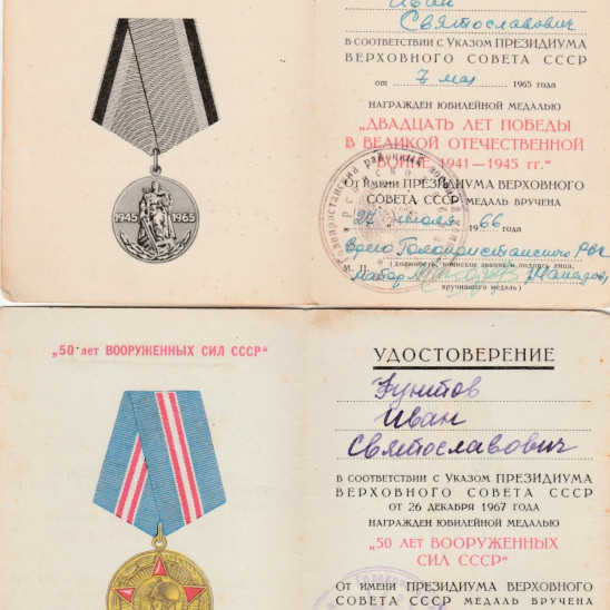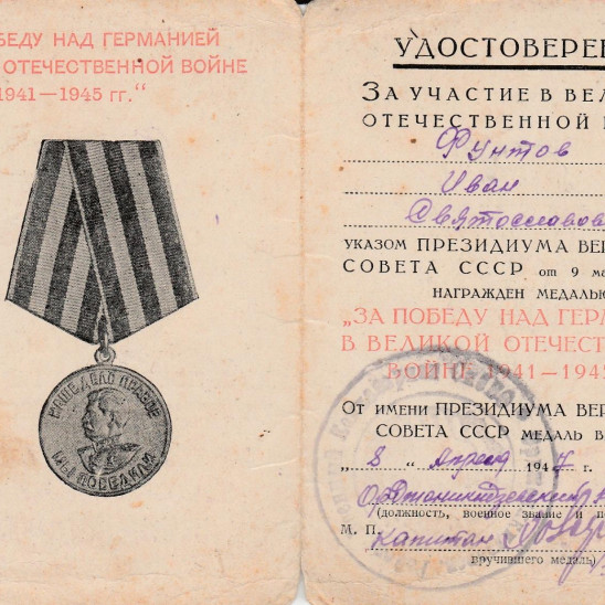Боевой путь ветерана Мой прадед Фунтов Иван СвятославовичУшел на фронт в тысяча девятьсот сорок первом году.Вернулся в звании гвардии Старшина.Служил в стрелковой бригаде минометной батареи. Прошел от Москвы до Германии.Победу встретил в Австрии.Был удостоин Орденов за Боевые заслуги, Отечественной войны, за Победу над Германией, Красной звезды. МЫ ПОМНИМ, МЫ ГОРДИМСЯ!!
