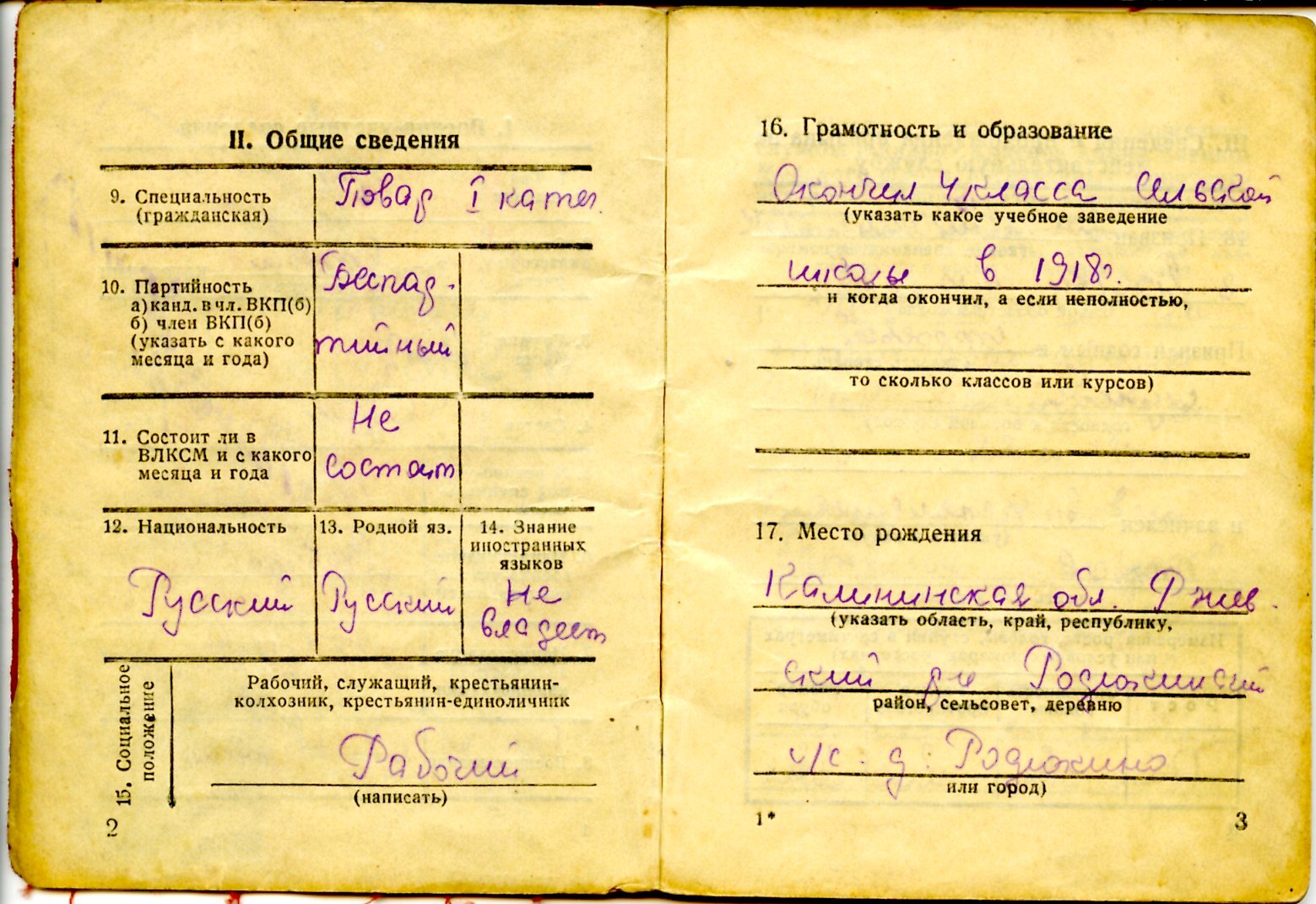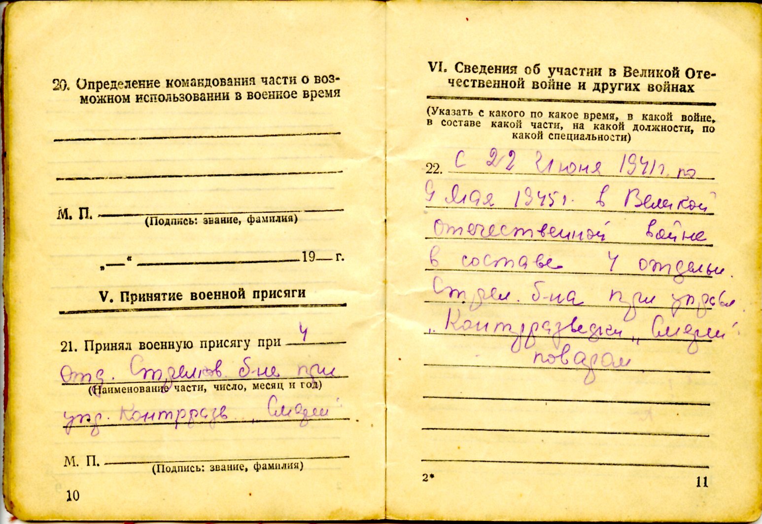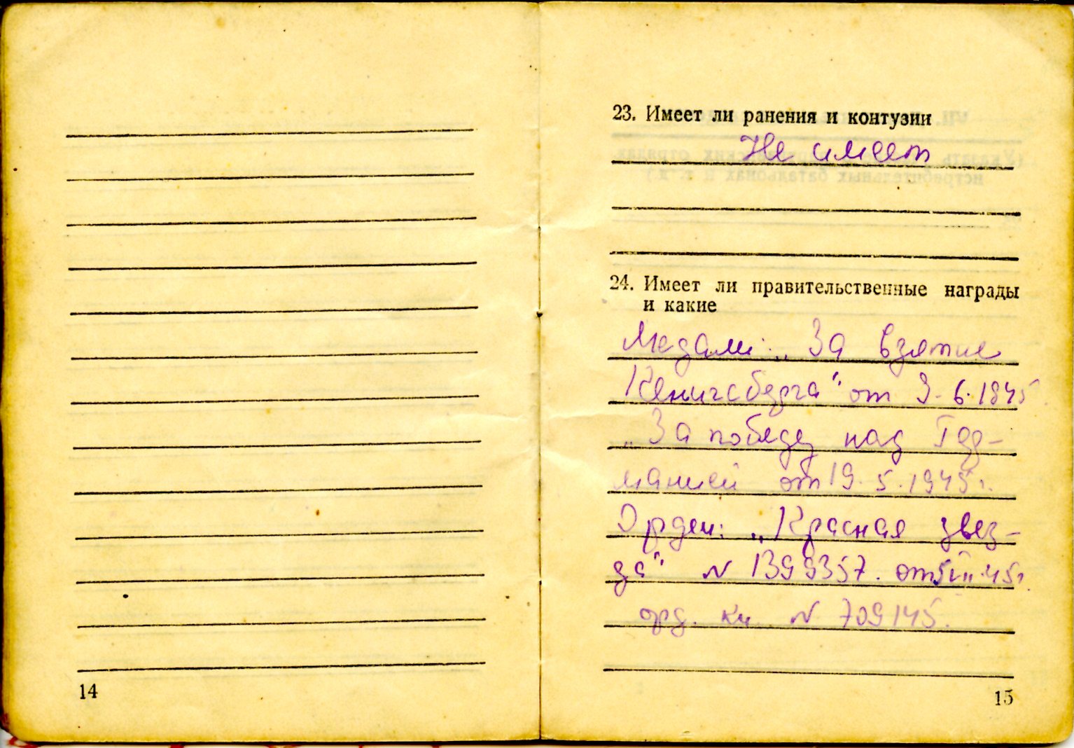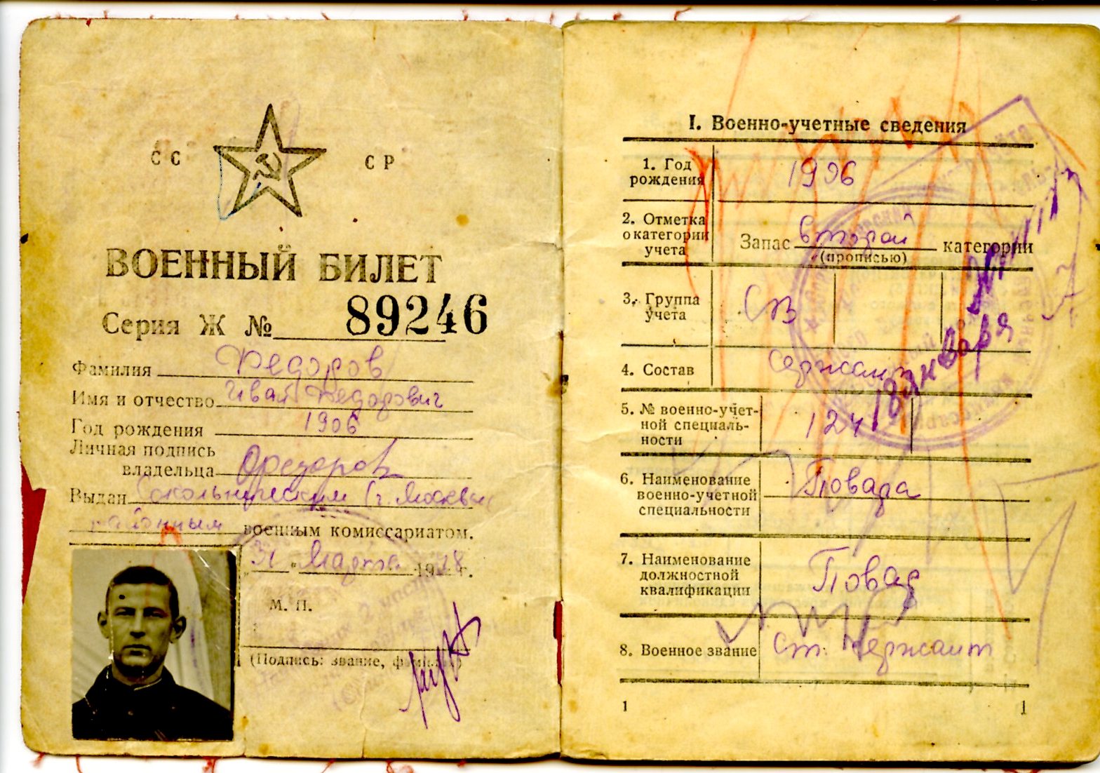 Мой прадед Федоров Иван Федорович родился в 1906 году в Калининской области Ржевском районе деревне Радюкино. В 1918 году закончил 4 класса сельской школы. И через некоторое время переехал в Москву. Жил в доме на две семьи в Сокольниках на терртории парка на одном из Просеков. 22.06.1941 года призван по мобилизации Валдайским РВК Ленинградской области в 4 отд. стрелкового батальона при управлении контрразведки "Смерш". Прошел всю войну вполть до июля 1945 года. Кантузий не имел. Имел такие правительственные награды как: Медали "За взятие Кенингсберга" от 09.06.1945г, "За победу над Германией" от 19.05.1945г, а также орден "Красная Звезда" №1399357 от 09.07.1945г орд. кл. №709145.