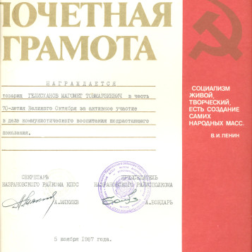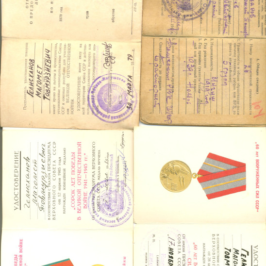 Мой дедушка, Гелисханов Магомет Товмурзиевич, родился в мае 1919 года в с. Долаково в Назрановском районе Республики Ингушетия. Учился в сельской школе, затем работал в Долаковском колхозе. В ноябре 1939 года Магомет Товмурзиевич был призван в ряды Красной армии в 117-й кавполк. Во время службы в армии участвовал в советско-финской войне. Великую Отечественную войну он встретил в 44-м артполку. Начиная с 1941 года и по май 1946 года дедушка проходил службу шофером в 118-й авиабазе 169-го автобатальона 15-й воздушной армии. В 1945 году дедушка принял участие в Пражской операции по освобождению Чехословакии. Демобилизовался из армии в 1946 году. За время прохождения службы был награжден медалями: "За отвагу", "За победу над Германией", "За оборону Москвы" и другими. После демобилизации дедушка работал шофером в Совхозе "40 лет Октября". Женился и у него родились 7 детей. Перед своей смертью дедушка завещал, чтобы всего награды были переданы в Ингушский Государственный музей краеведения им. Т.Х. Мальсагова. Дедушки не стало 15 ноября 1989 года.