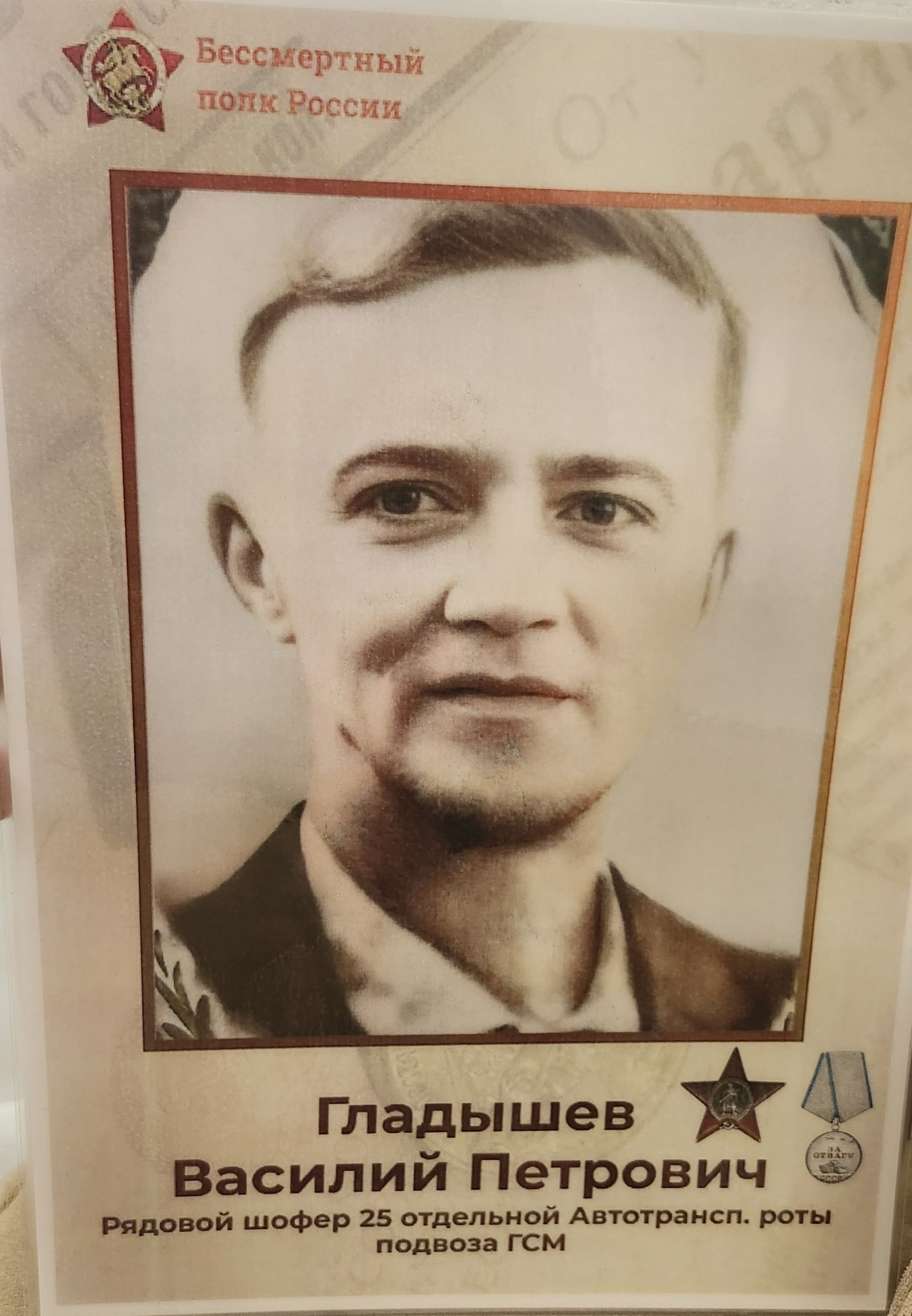 Дата призыва 07.1941 Место рождения Московская обл., Орехово-Зуевский р-н, п. Кировский Воинская часть 14 запасная стрелковая бригада; 138 гвардейский стрелковый полк 48 гвардейской стрелковой дивизии; 359 запасной стрелковый полк 14 запасной стрелковой дивизии За проявленую доблесть и мужество от имени Президиума Верховного Совета Союза ССР орденом "Красная Звезда" награжден: Рядовой Гладышев Василий Петрович 1906 г.р. шофера 25 отдельной Автотранспортной роты подвоза ГСМ от 25.10.1944 г. Красноармеец Гладышева за время пребывания в роте показал себя дисциплинированным и отлично знающим свое дело. Работая в должности слесаря с выше одного года по капитальному ремонту авто двигателей, не смотря на большой износ двигателей тов. Гладышев широко применяет реставрацию деталей, благодаря его приспособлениям для заливки и расточки коренных и шатунных подшипников рота освобождена от внешних зависимостей. Тов. Гладышев в кротчайшие строки выпускает их Капитального ремонта двигатели, прекрасного качества. Красноармеец Гладышев достоин правительственной награды орден «Красной звезды». Достоин правительственной награды медалью "За Отвагу" Командир 25 танкового корпуса гвардии полковник Петровский. 30.10.1944 г.