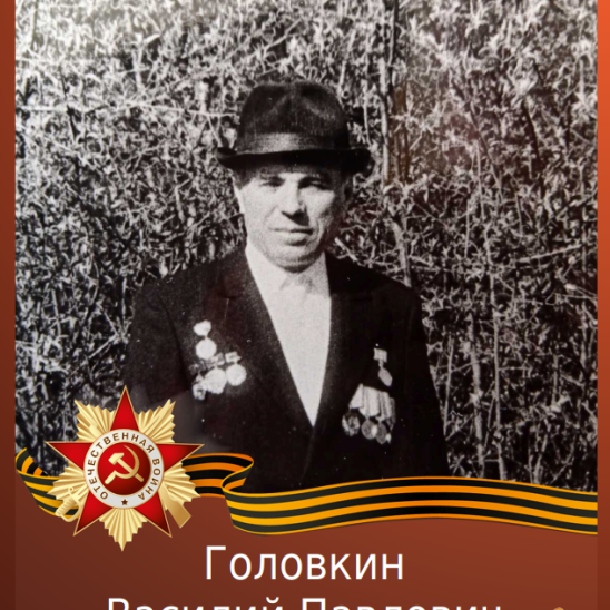 Участник Великой Отечественной войны рядовой Головкин Василий Павлович родился 14.03.1926 в деревне Казанка Шарьинского района Костромской области. В Красную Армию призван в 17-летнем возрасте 29 октября 1943 года. С октября 1943 года по май 1944 года проходил обучение в 16 отдельном учебном танковом полку. С мая по сентябрь 1944 года воевал командиром орудия танка в составе 33 отдельной гвардейской танковой бригады, освобождал Украину. В сентябре и октябре 1944 года воевал с фашистами в составе 41 танковой бригады 5 танкового корпуса 2-го Прибалтийского фронта. 1 октября 1944 года в бою при освобождении города Рига был ранен – из 7 членов экипажа танка в живых остались он и механик-водитель танка. После излечения в 268 эвакуационном госпитале опять направлен на фронт, освобождал от фашистов Эстонию, Латвию, Литву. День Победы 9 мая 1945 года встретил в составе 12 отдельного учебного танкового полка Ленинградского фронта. После окончания войны проходил действительную военную службу в Красной Армии в 147 отдельном батальоне связи (август 1945 – март 1946), в 22 укрепленном районе (март – сентябрь 1946) на границе с Финляндией, в 45 авторемонтной мастерской (сентябрь 1946 – апрель 1950). 20 апреля 1950 года демобилизован из рядов Красной Армии в запас. За мужество и героизм, проявленные в боях с немецко-фашистскими захватчиками, награжден орденом Отечественной войны II степени и медалью «За победу над Германией».