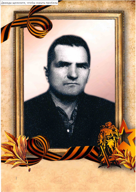 КРАСНОАРМЕЕЦ, УРОЖЕНЕЦ с. ЗОРИНО, КРИВЦОВСКОГО РАЙОНА, КУРСКОЙ ОБЛАСТИ. РОДИЛСЯ В 1913Г.ВОЕВАЛ НА БЕЛОРУССКОМ ФРОНТЕ В СОСТАВЕ САПЕРНОГО ВЗВОДА. В МИРНОЕ ВРЕМЯ РАБОТАЛ КУЗНЕЦОМ. ВИРТУОЗНО ИГРАЛ НА ТУЛЬСКОЙ ГАРМОШКЕ. БЕЗ НЕГО НЕ ОБХОДИЛАСЬ НИ ОДНА ГУЛЯНКА... УМЕР В 1988Г....
